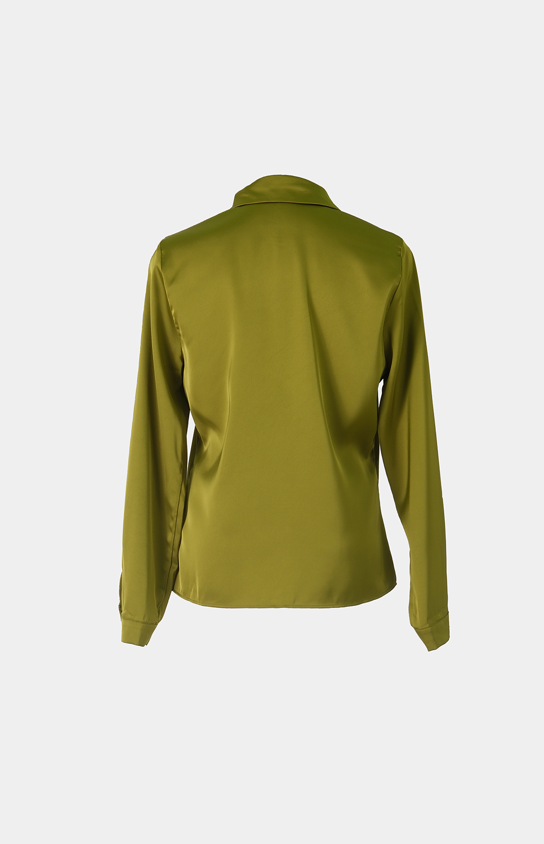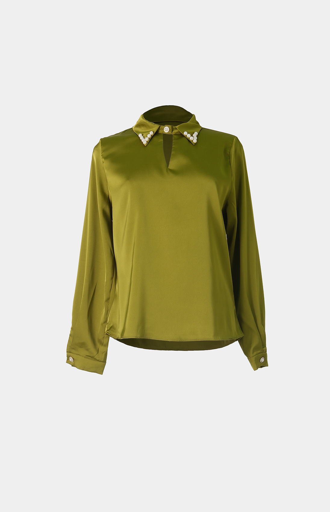 Blusa satinada de manga larga destaca por su elegante cuello decorado con perlas en las puntas y botones a juego.