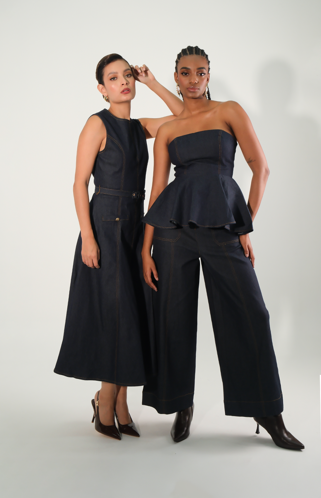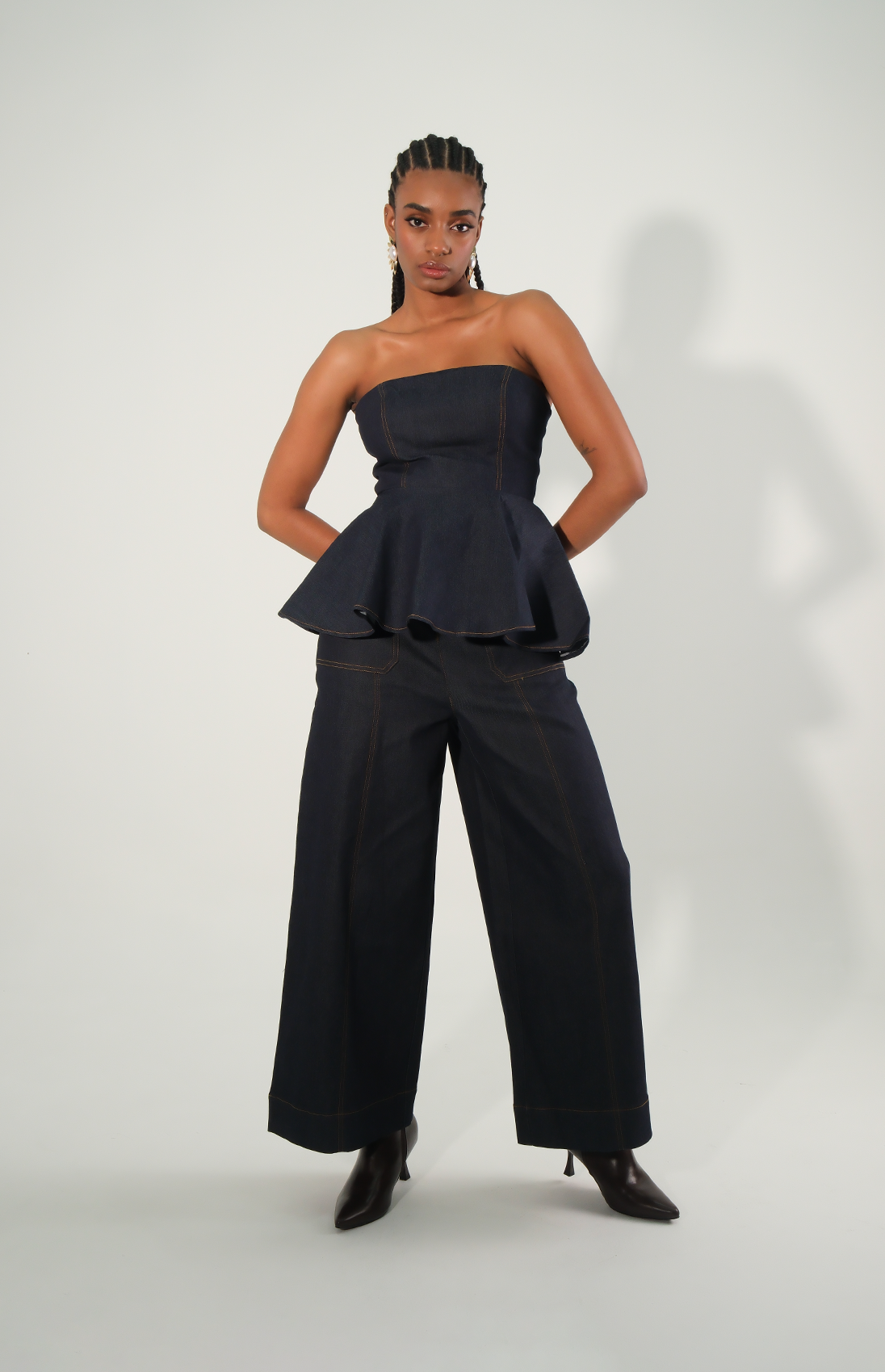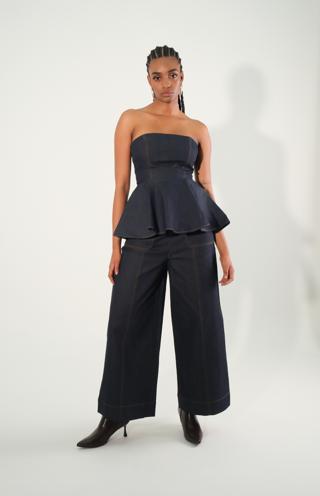 Blusa strapless en denim con peplum en la cintura. Esta prenda combina la versatilidad del denim clásico con un toque de sofisticación moderna, creando una silueta favorecedora y contemporánea.