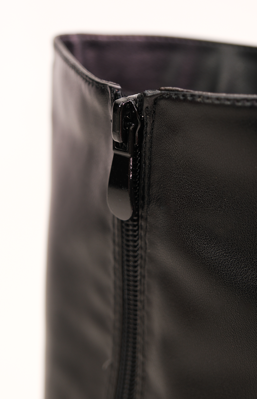 Bota de color negro, diseñada con cremallera lateral fácil de utilizar, correa decorativa de hebilla dorada y tacón de altura 7 cm.