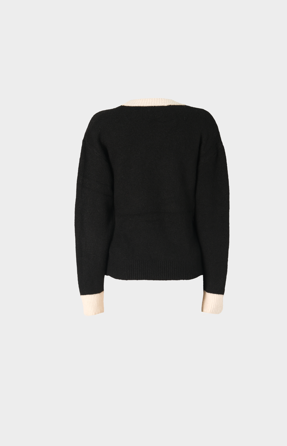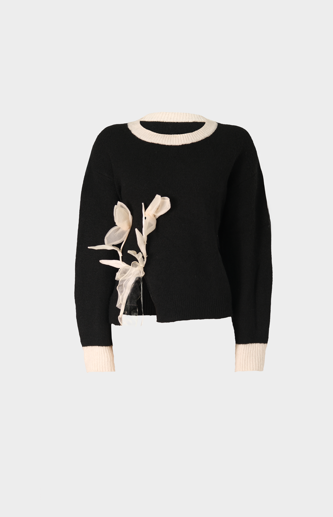 Jersey negro de cuello redondo con bordes en beige que definen con precisión el cuello y los puños. Un motivo floral bordado artesanal en el lado derecho de gracia y personalidad.
