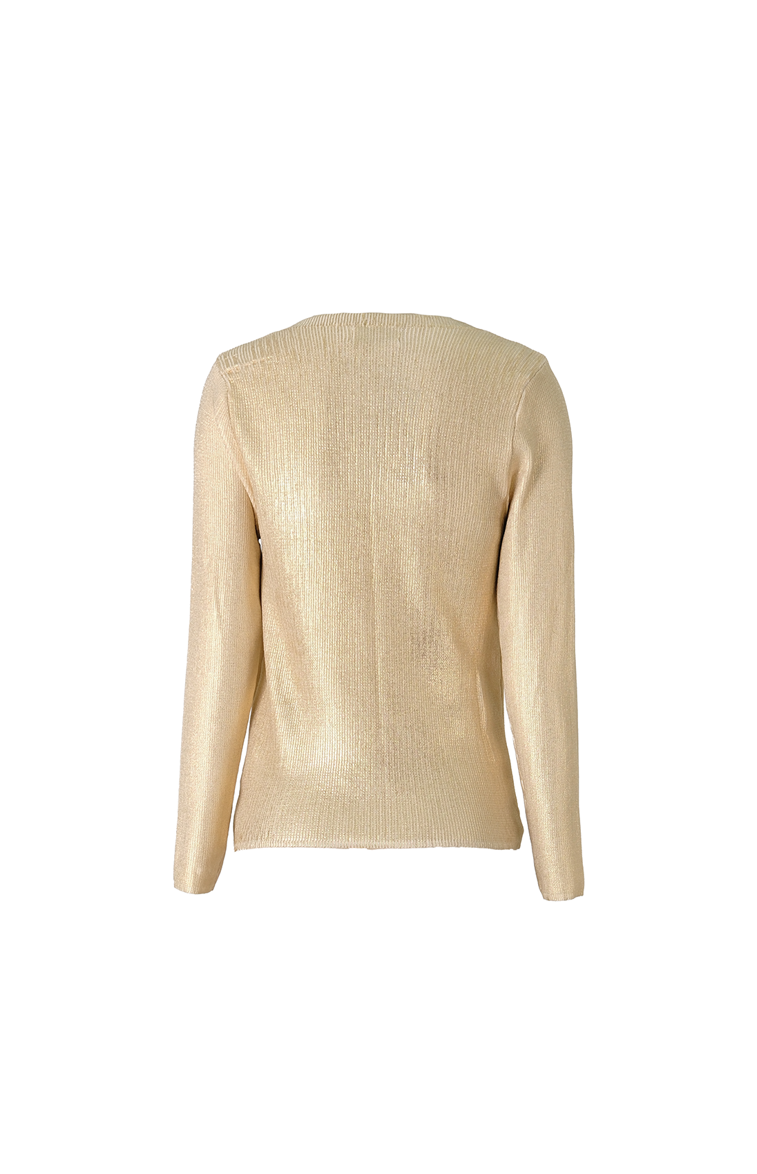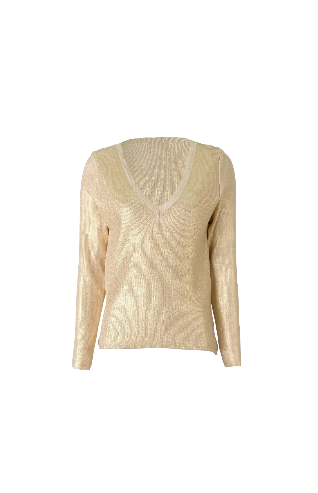 Buso Beige Brillante - Este buso beige con cuello V y un toque de brillo es perfecto para un look elegante y moderno. ¡Añádelo a tu colección y deslumbra en cualquier evento!