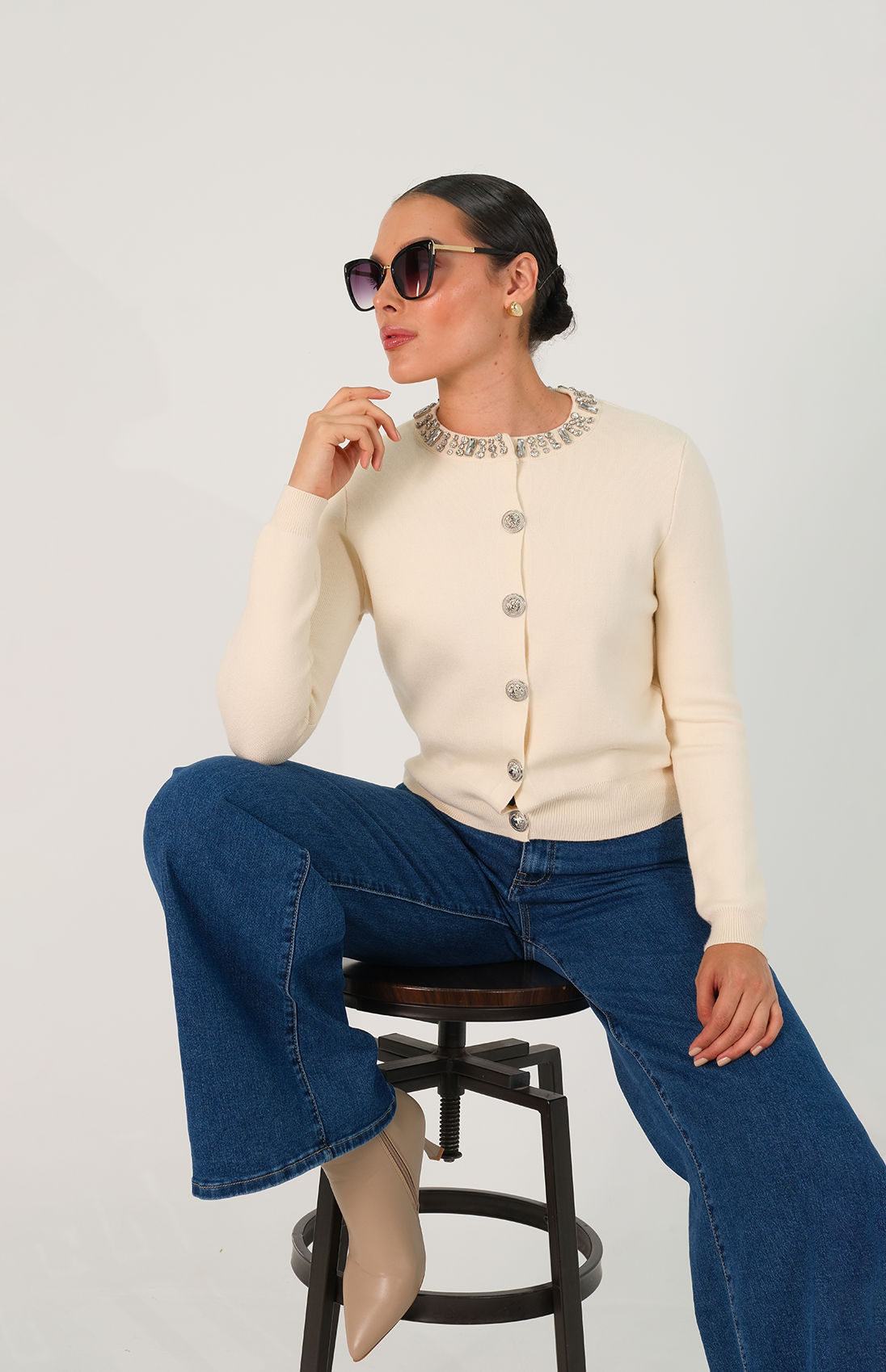 Jersey beige de cuello redondo con apliques plateados; y cinco botones plateados crean una línea visual impecable. Una pieza versátil que transita sin esfuerzo entre lo formal y lo casual.