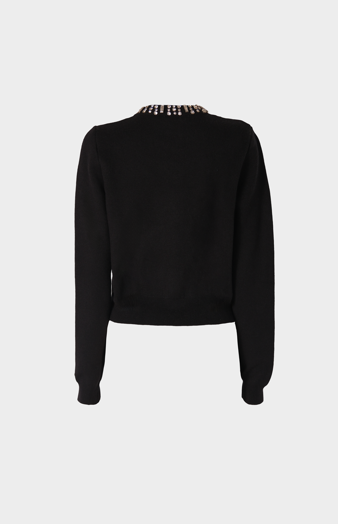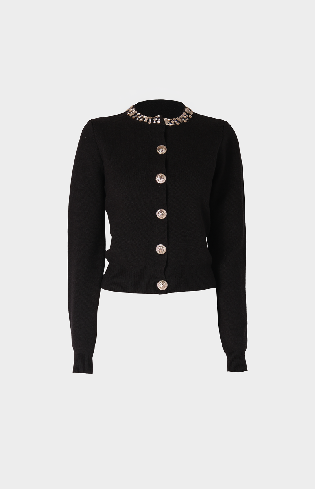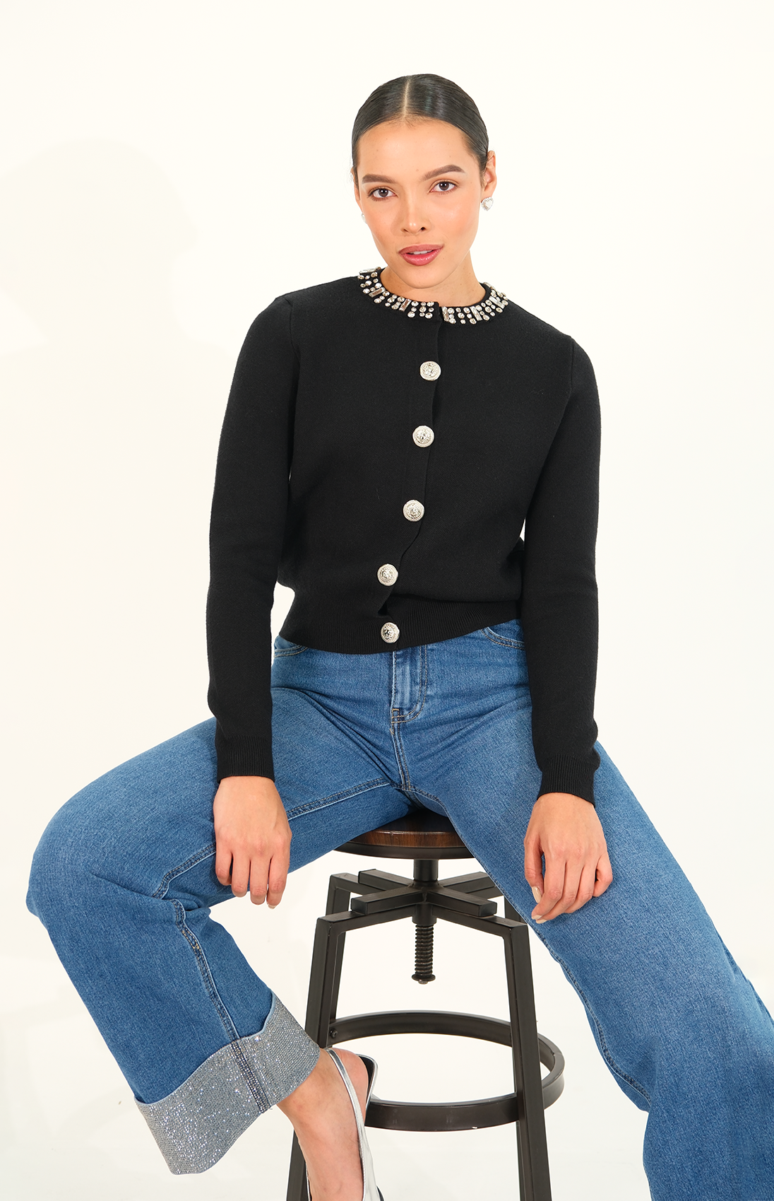 Jersey negro de cuello redondo con apliques plateados; y cinco botones plateados crean una línea visual impecable. Una pieza versátil que transita sin esfuerzo entre lo formal y lo casual.