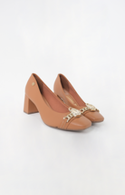 Stiletto en color camel con punta cuadrada y detalle de candado dorado. ¡Añade un toque sofisticado a tu look! ¡Compra ahora!