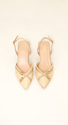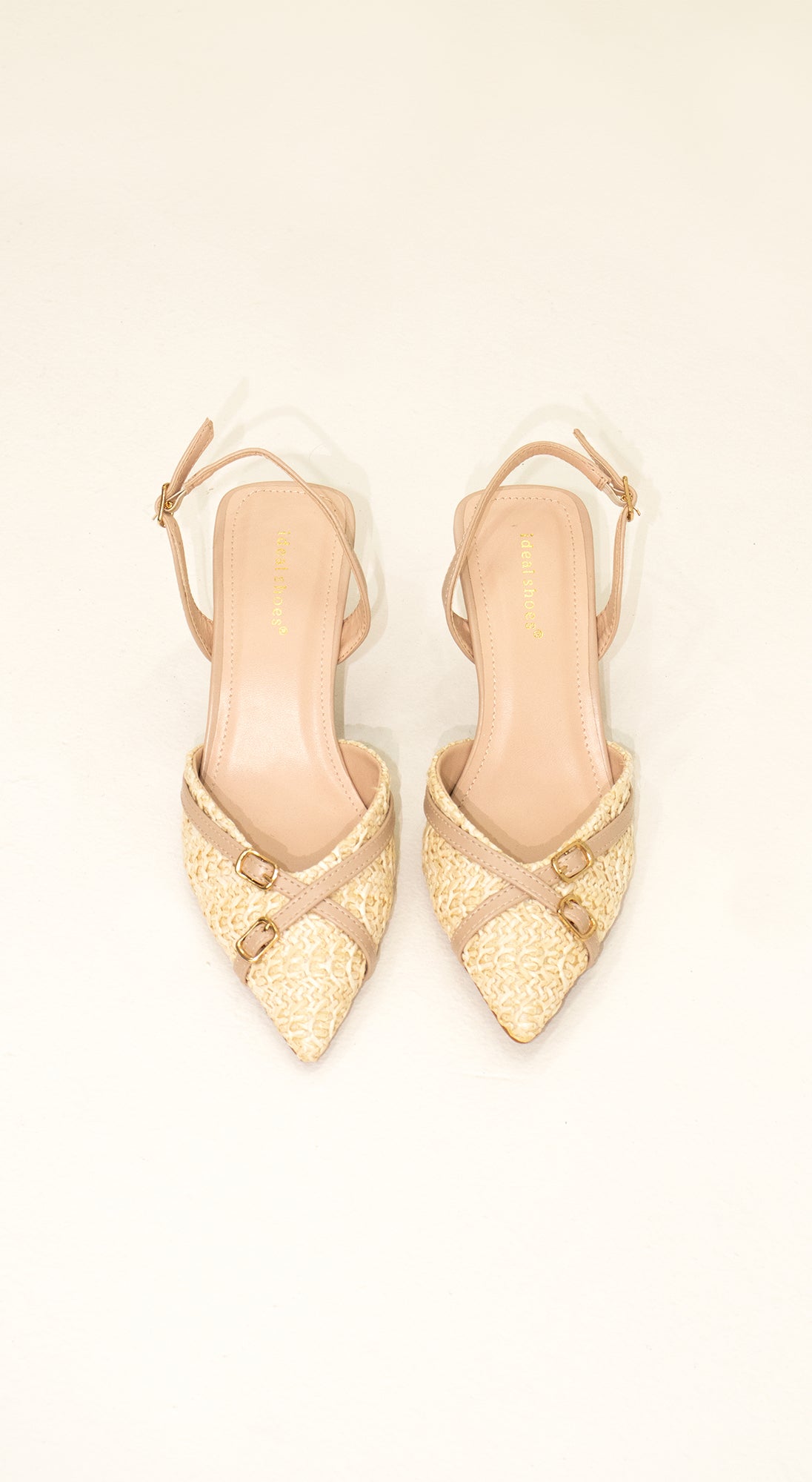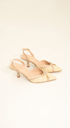 Stiletto destalonado slingback de textura natural con tacón bajo, en tono nude y hebillas doradas. perfecto para la playa o un look casual de ciudad.