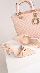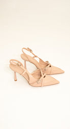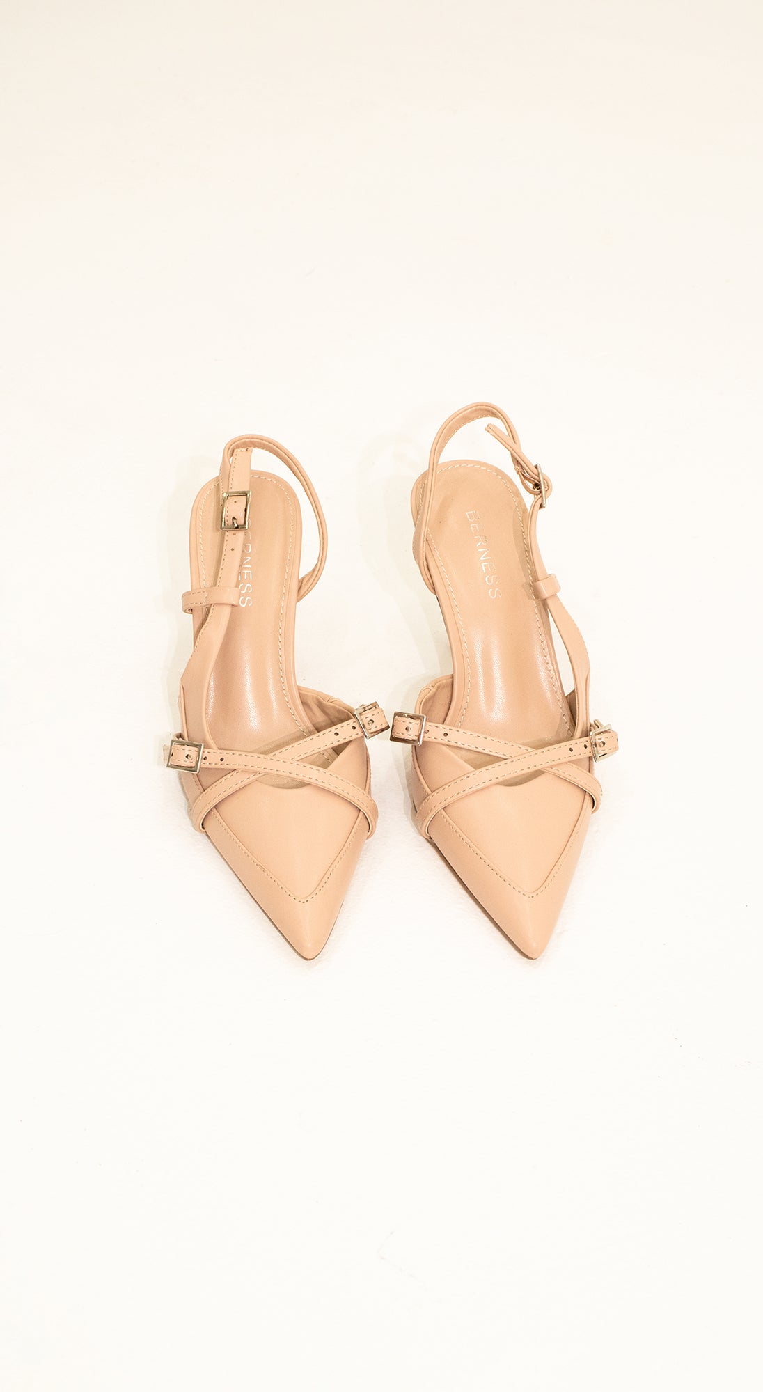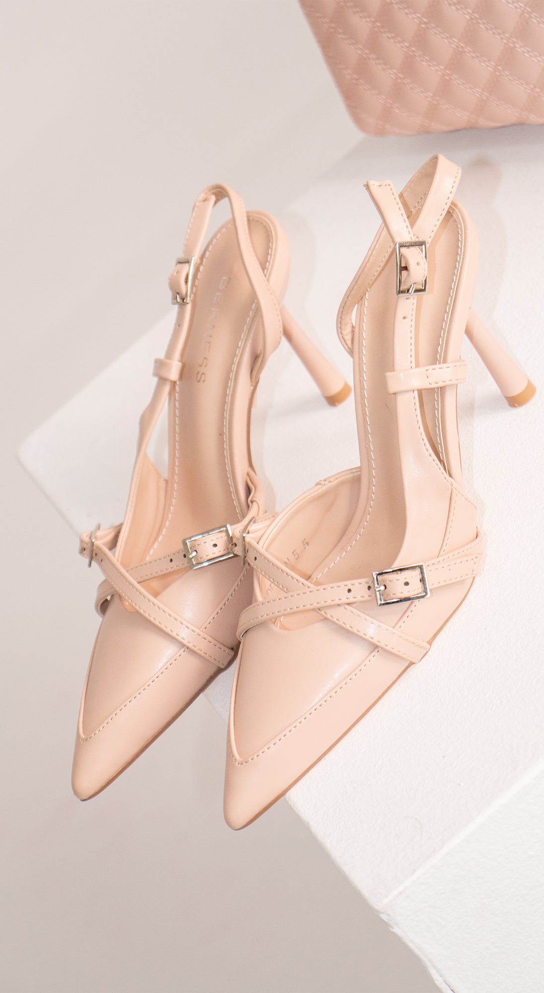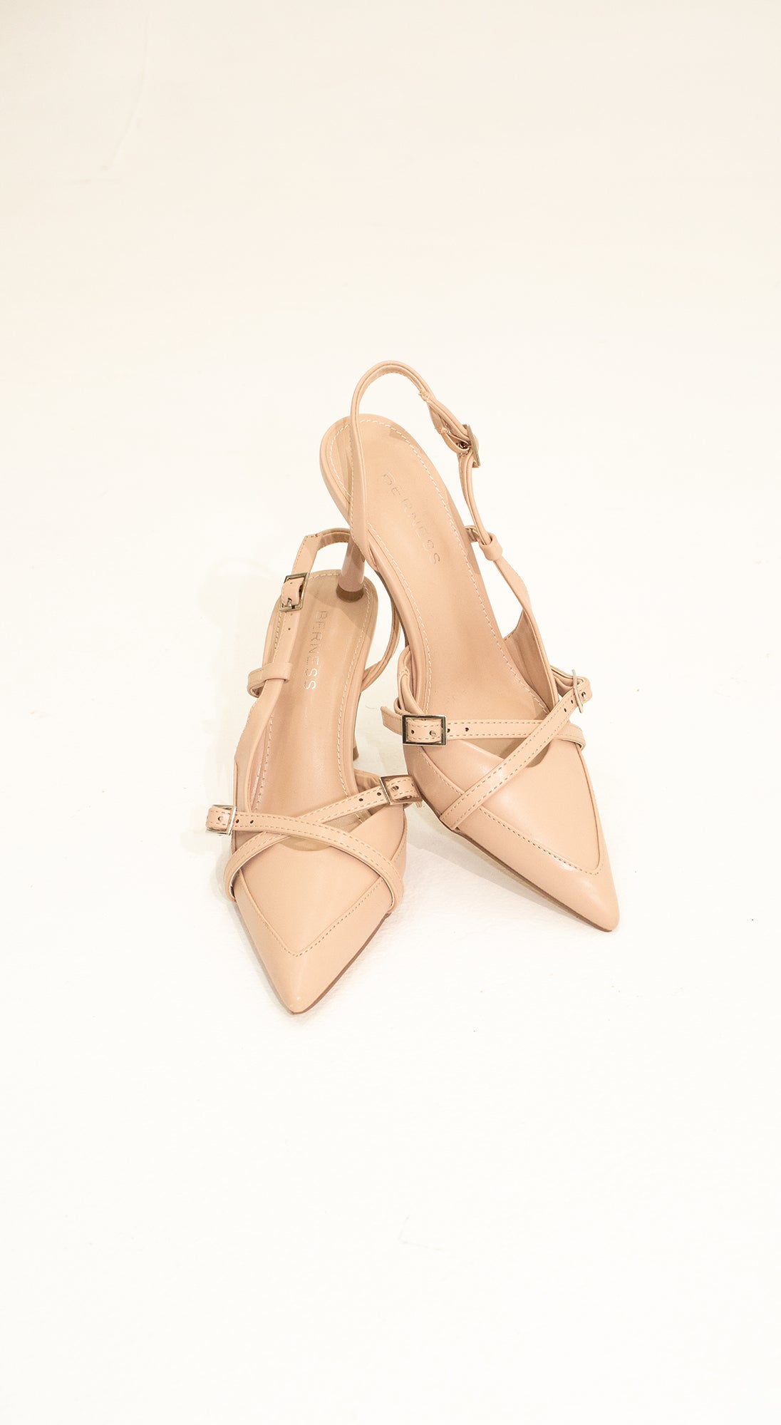 Stilettos beige destalonados de tacón bajo, con correas, perfectos para eventos formales o para elevar tu look diario.