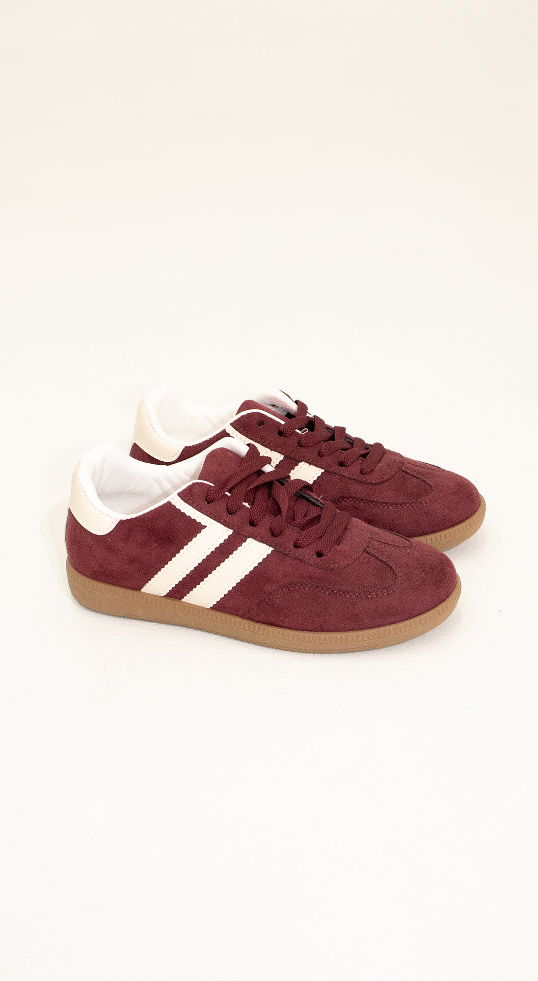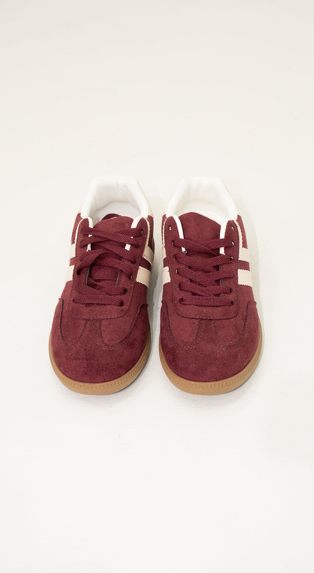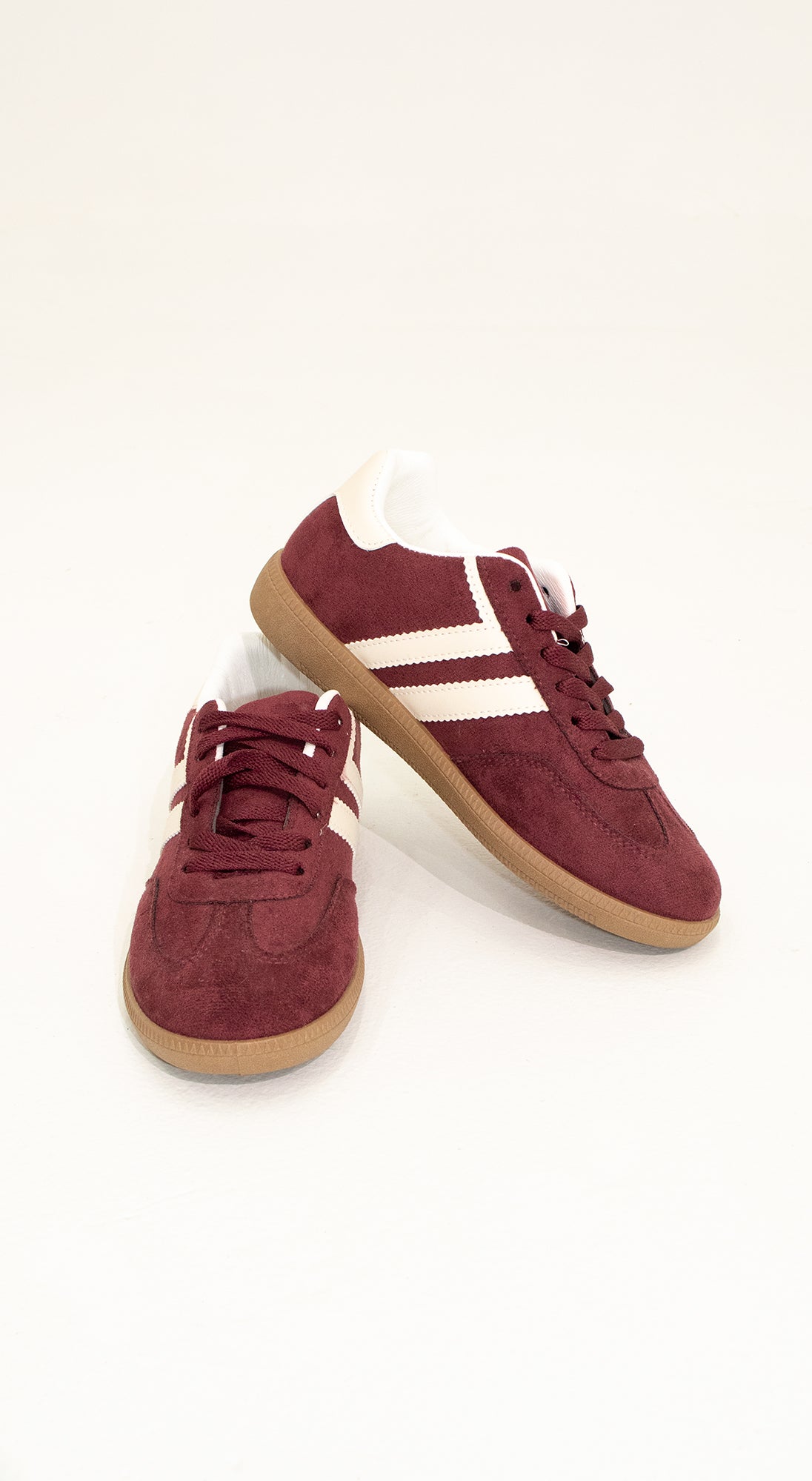 Zapatillas de material tipo gamuza en color rojo vino. Su diseño clásico con rayas contrastantes los convierte en las zapatillas deportivas perfectas para el día a día.