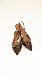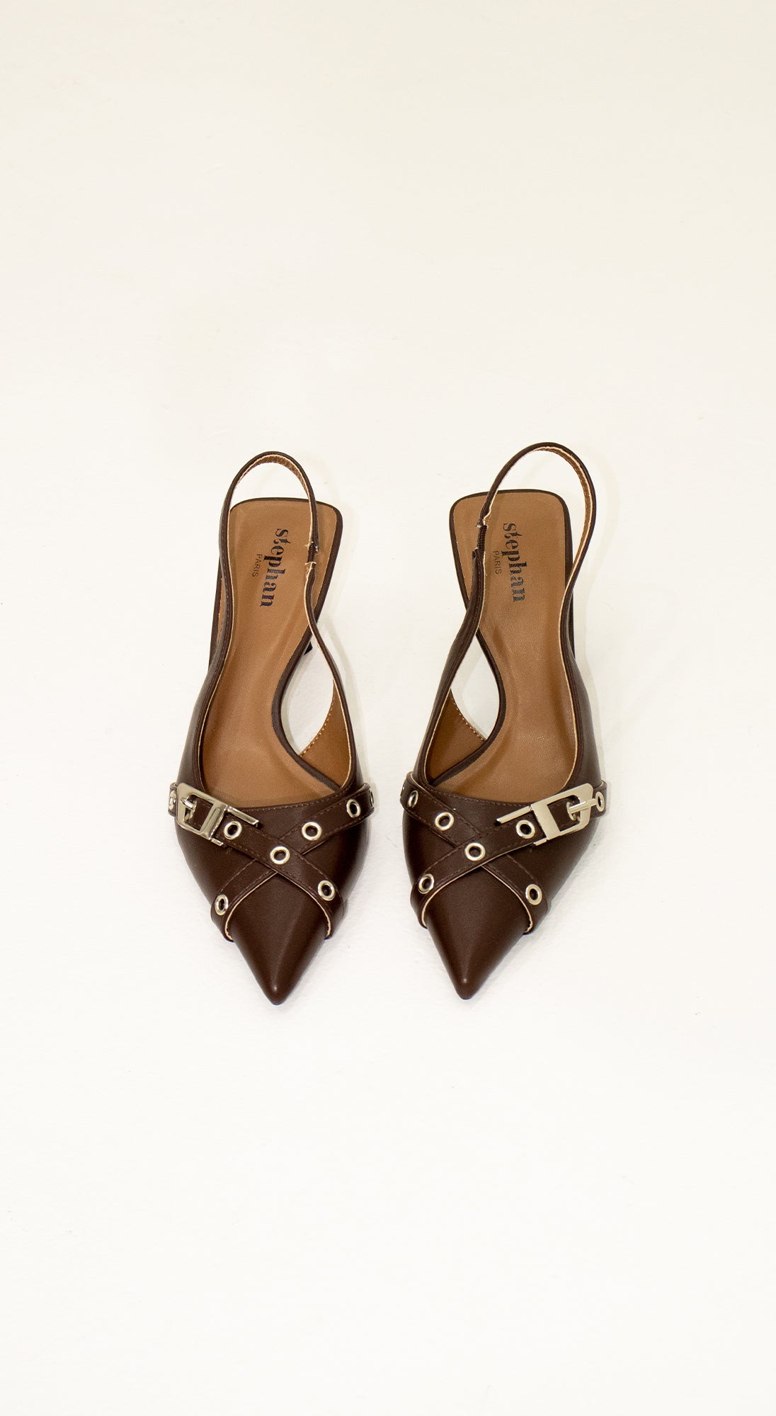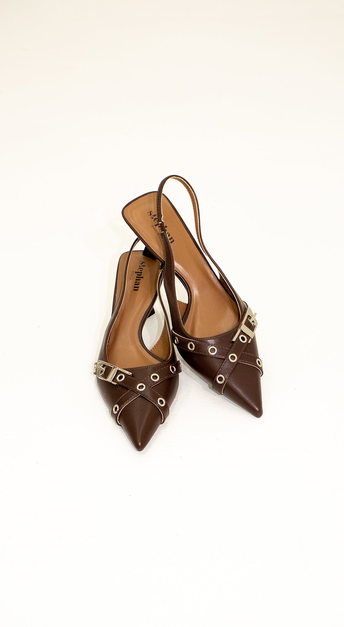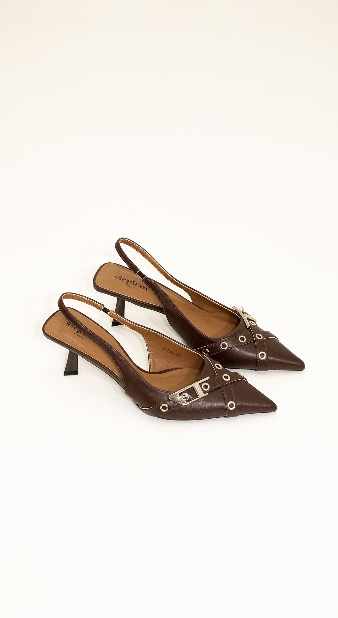 Stilettos destalonados color marrón, de tacón bajo, con diseño moderno y elegante. calzado versátil que se adapta a la oficia, outfits fashion u ocasiones especiales.