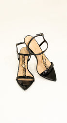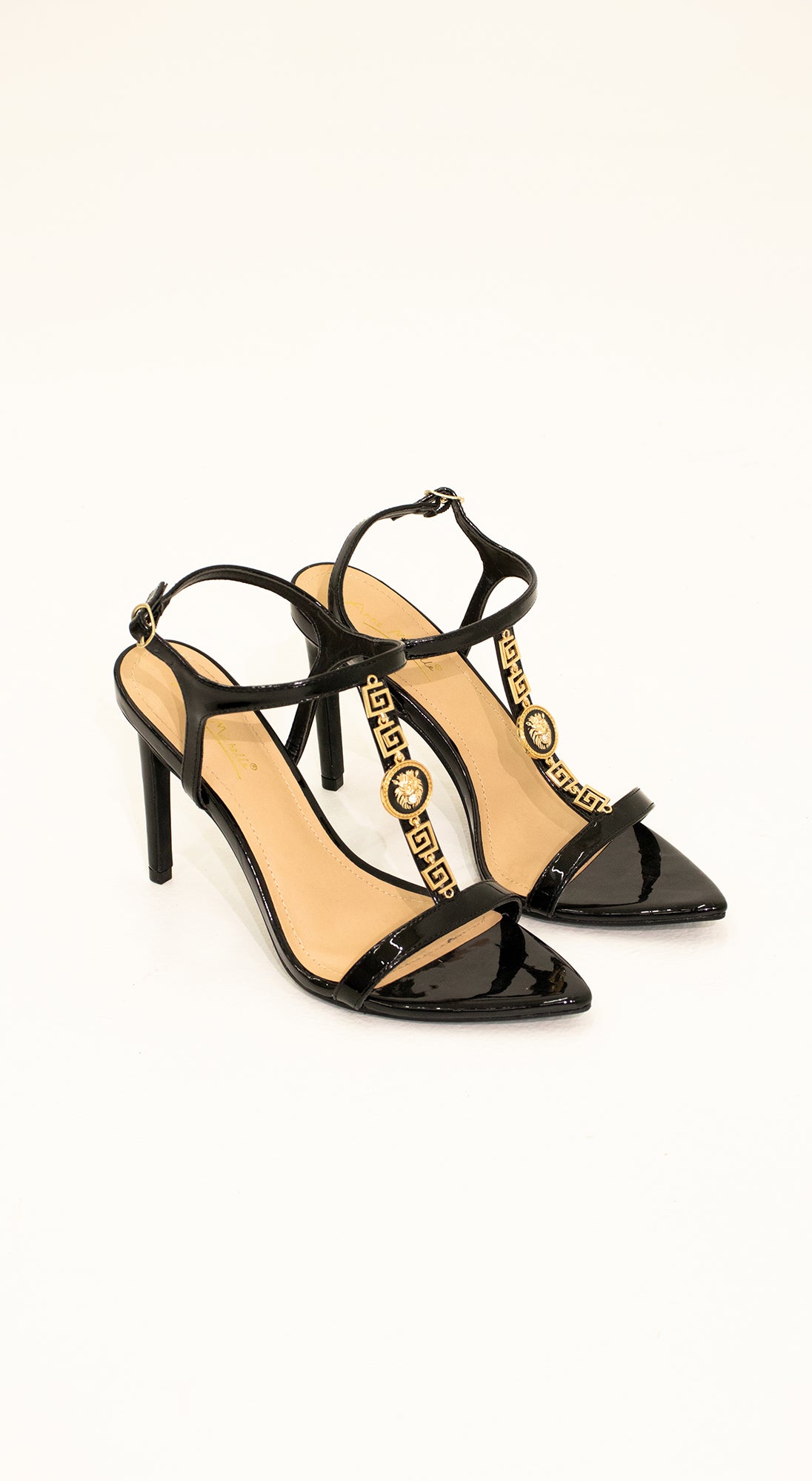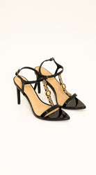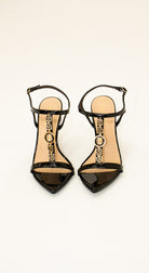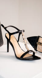 Sandalias negras de tacón alto en charol, con detalle dorado. Elegancia total para eventos formales y ocasiones especiales