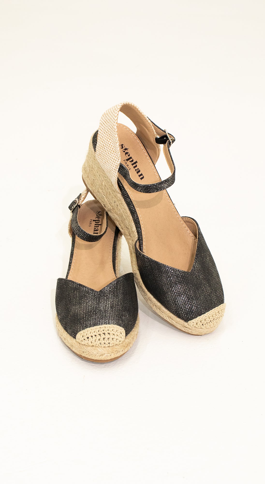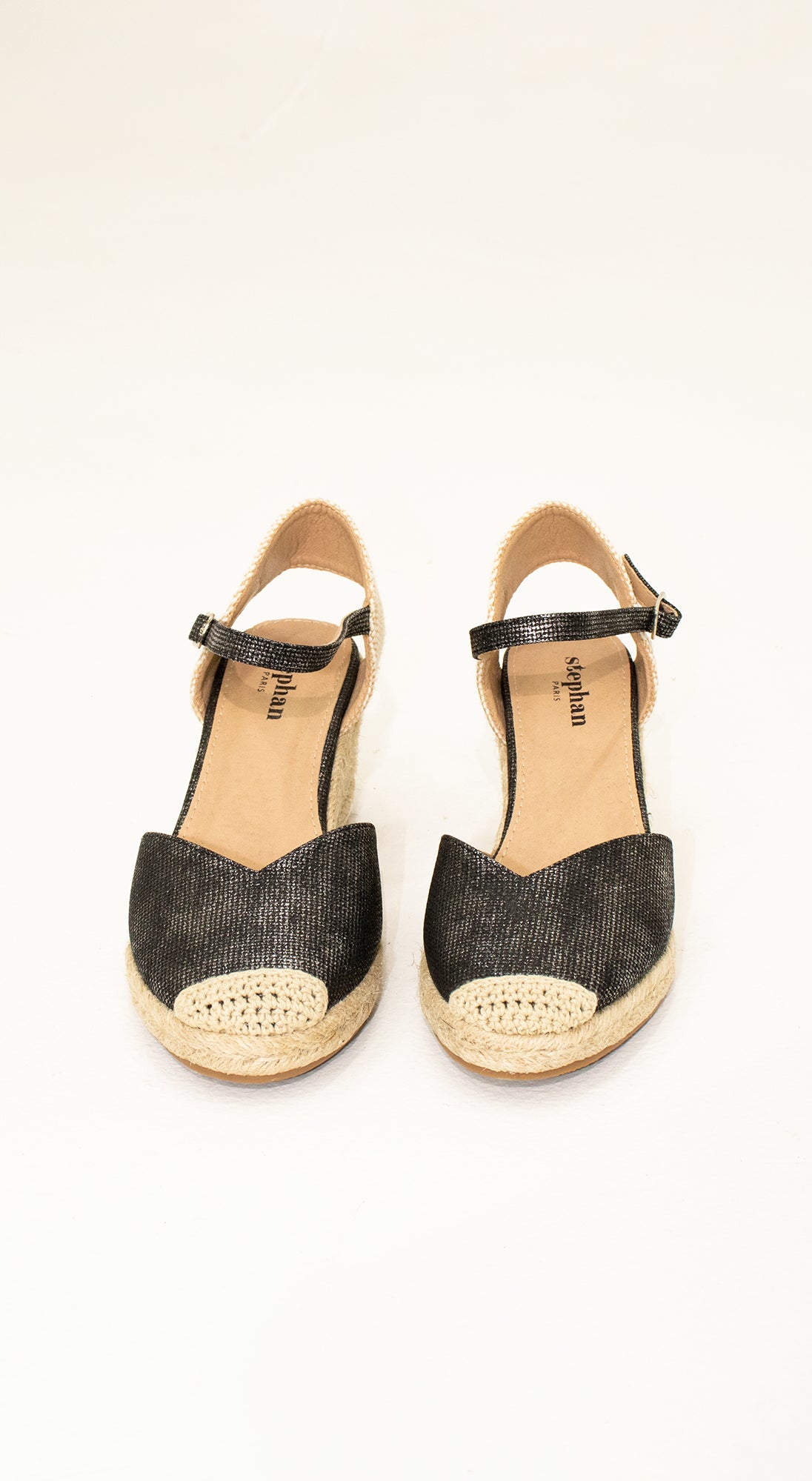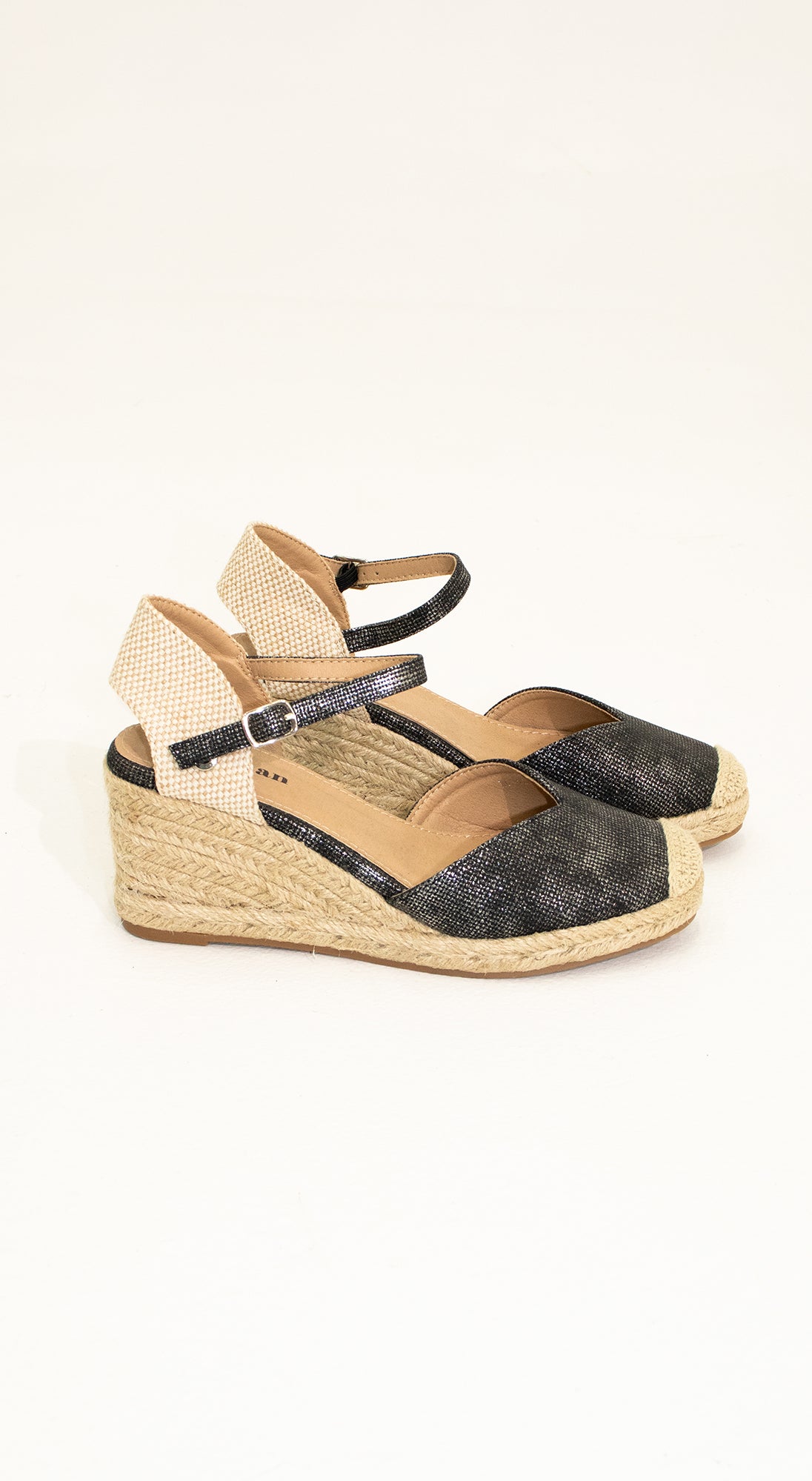 Sandalias negras con plataforma en yute, ideales para clima cálido. Combinan con outfits frescos y casuales.