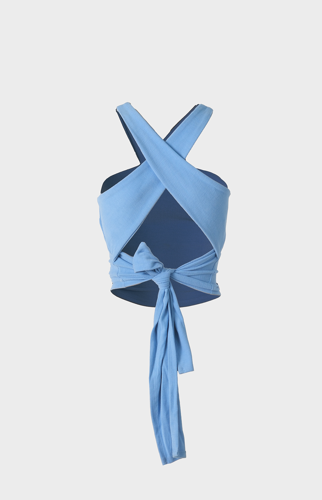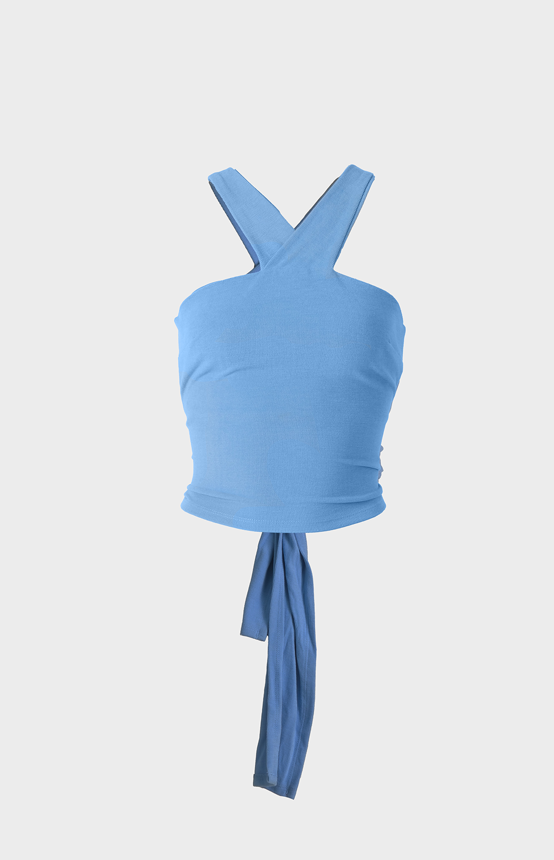 Crop top licrado cruzado en el cuello azul. ¡Perfecto para un look casual y moderno que te hará destacar!