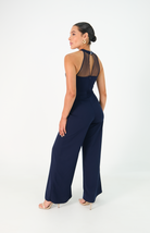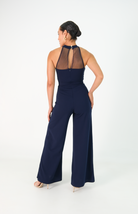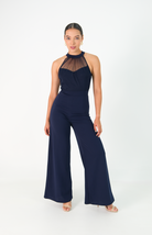 Este enterizo azul oscuro presenta un diseño sofisticado con cuello alto y pantalón de bota ancha, aportando un estilo moderno y elegante.