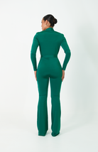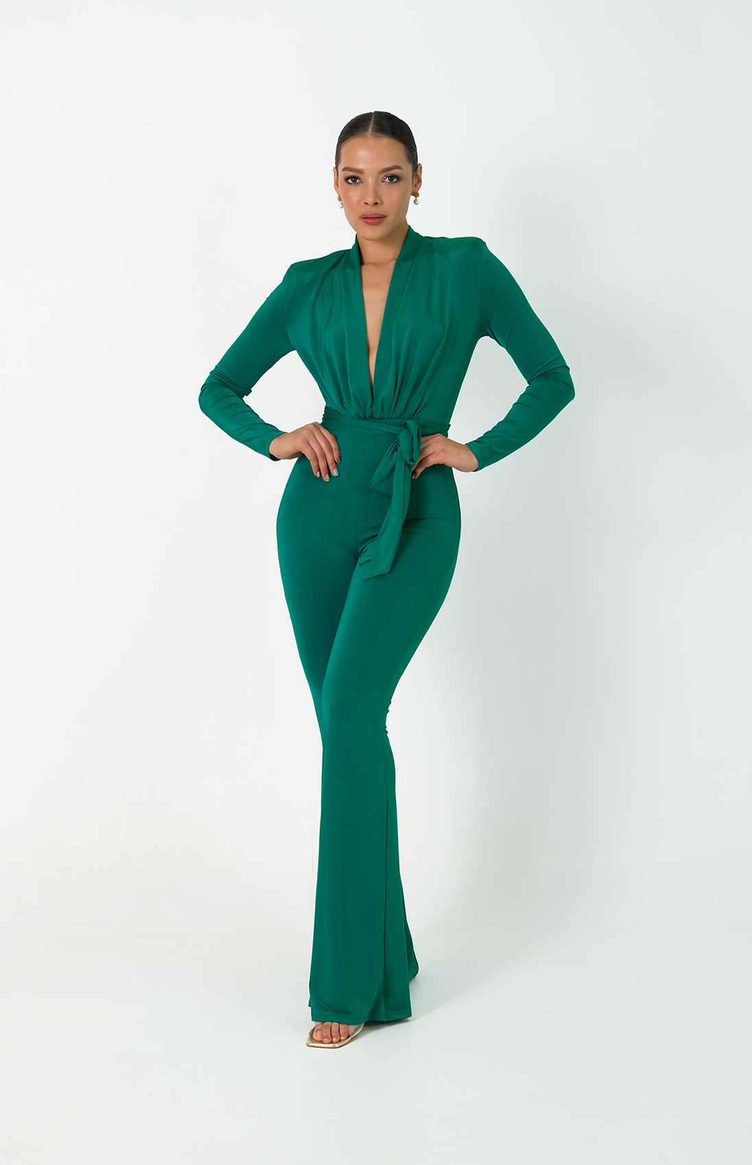 Este enterizo verde de manga larga combina un escote en V profundo con una silueta de bota campana, creando una apariencia elegante y moderna. Su cinturón integrado realza la cintura, ofreciendo una figura estilizada y sofisticada, ideal para ocasiones especiales donde quieras destacar con estilo y distinción.