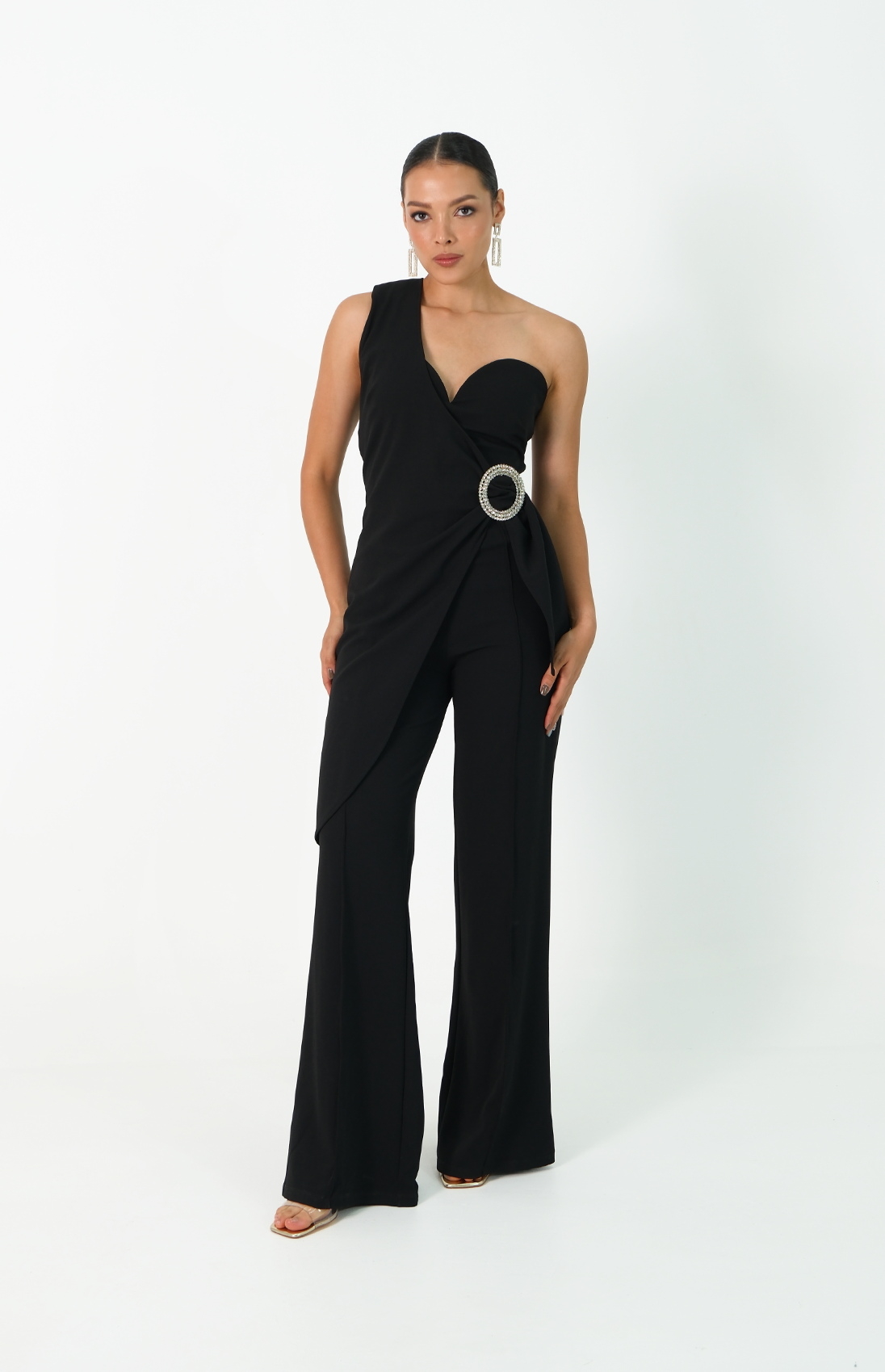 Este enterizo negro combina elegancia y estilo con su diseño de un solo hombro . Cuenta con copa que ofrece estructura y soporte, mientras que la sobrefalda aporta un toque distintivo y sofisticado. El cinturón con aro en perla resalta la cintura, creando una silueta armoniosa ideal para eventos especiales donde la sofisticación es clave.