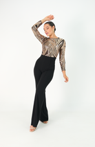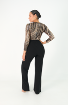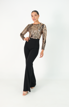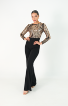 Este enterizo negro combina elegancia y modernidad con su parte superior decorada en lentejuelas doradas, que aportan un toque de brillo distinguido.Mientras que el pantalón bota recta crea una silueta alargada y refinada. Ideal para ocasiones formales donde busca un estilo impecable y contemporáneo.