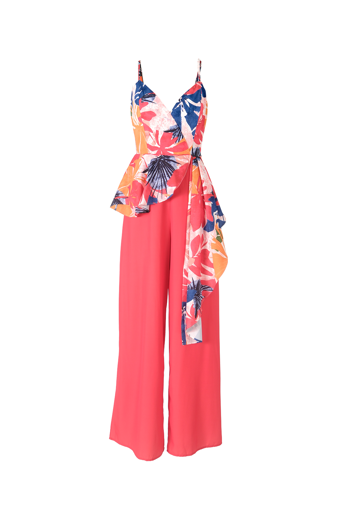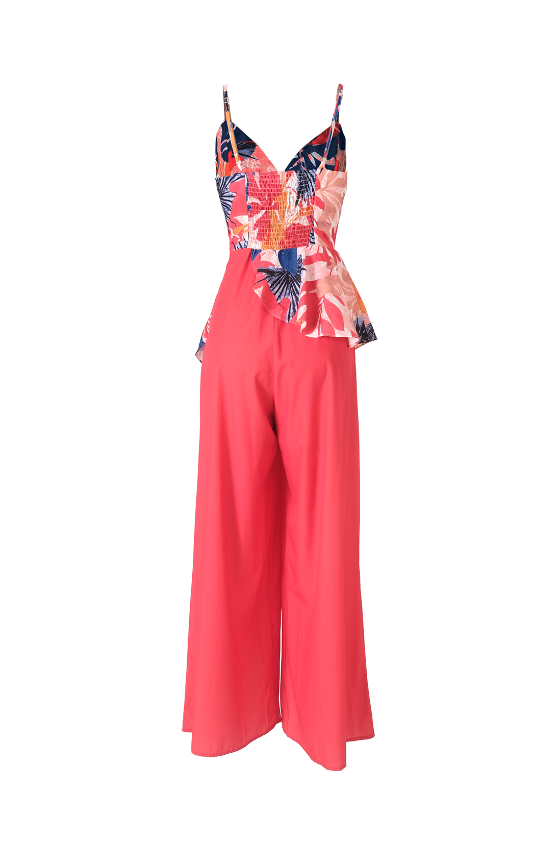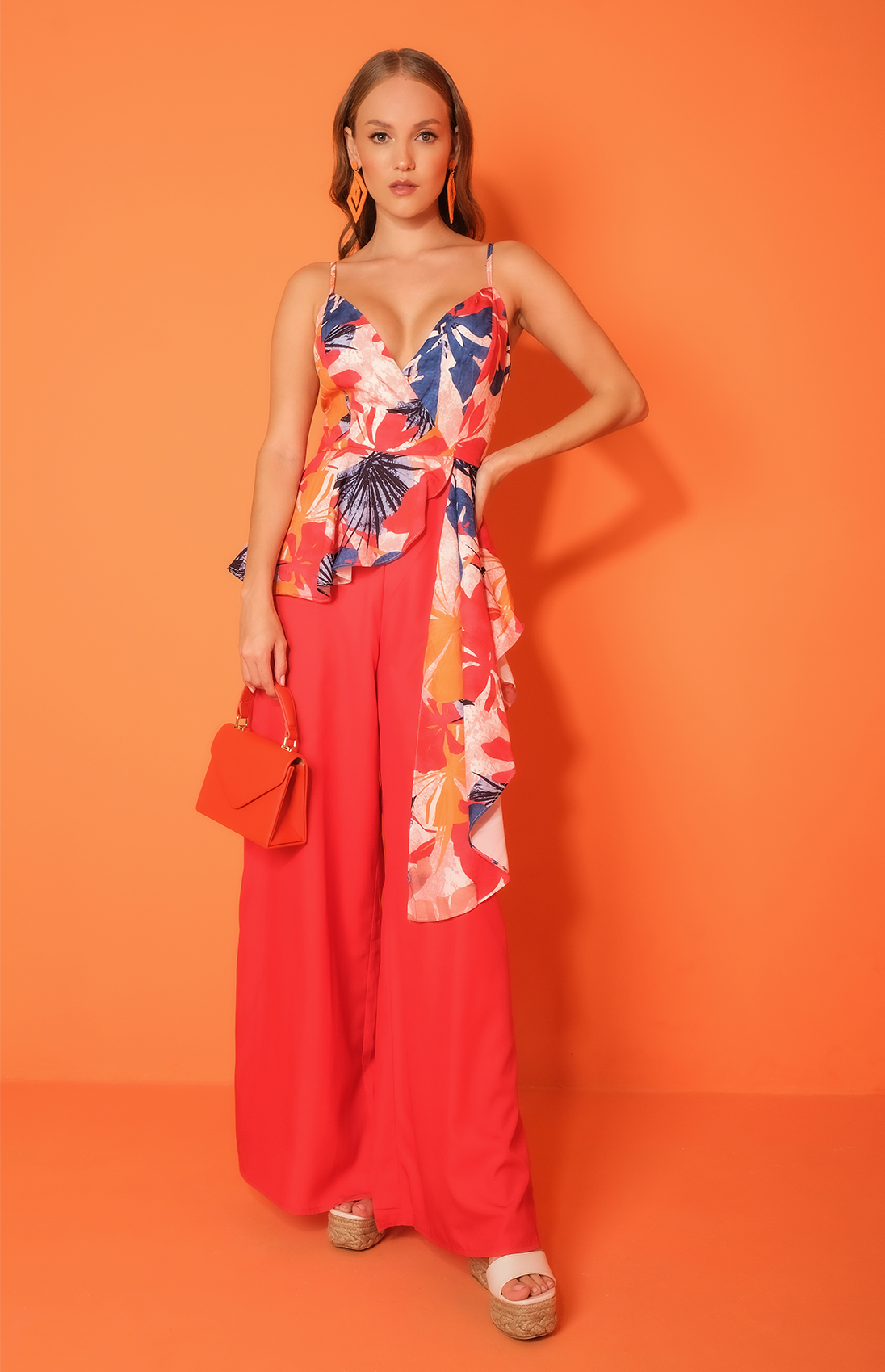 Frescura y Color en un Enterizo - Este enterizo de tiras con parte superior estampada y pantalón rojo es ideal para un look fresco y colorido. ¡Destaca con estilo y comodidad!