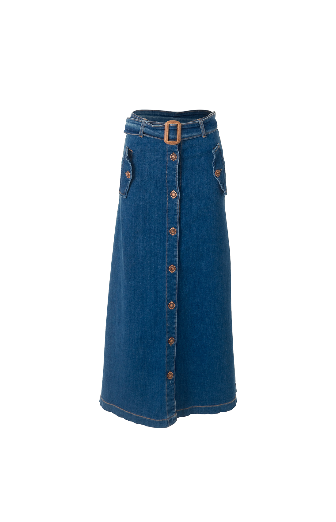 Estilo Casual y Chic - Falda denim larga con botones dorados, azul oscuro y cinturón con simulación de bolsillos. ¡Añade un toque casual y chic a tu look diario!