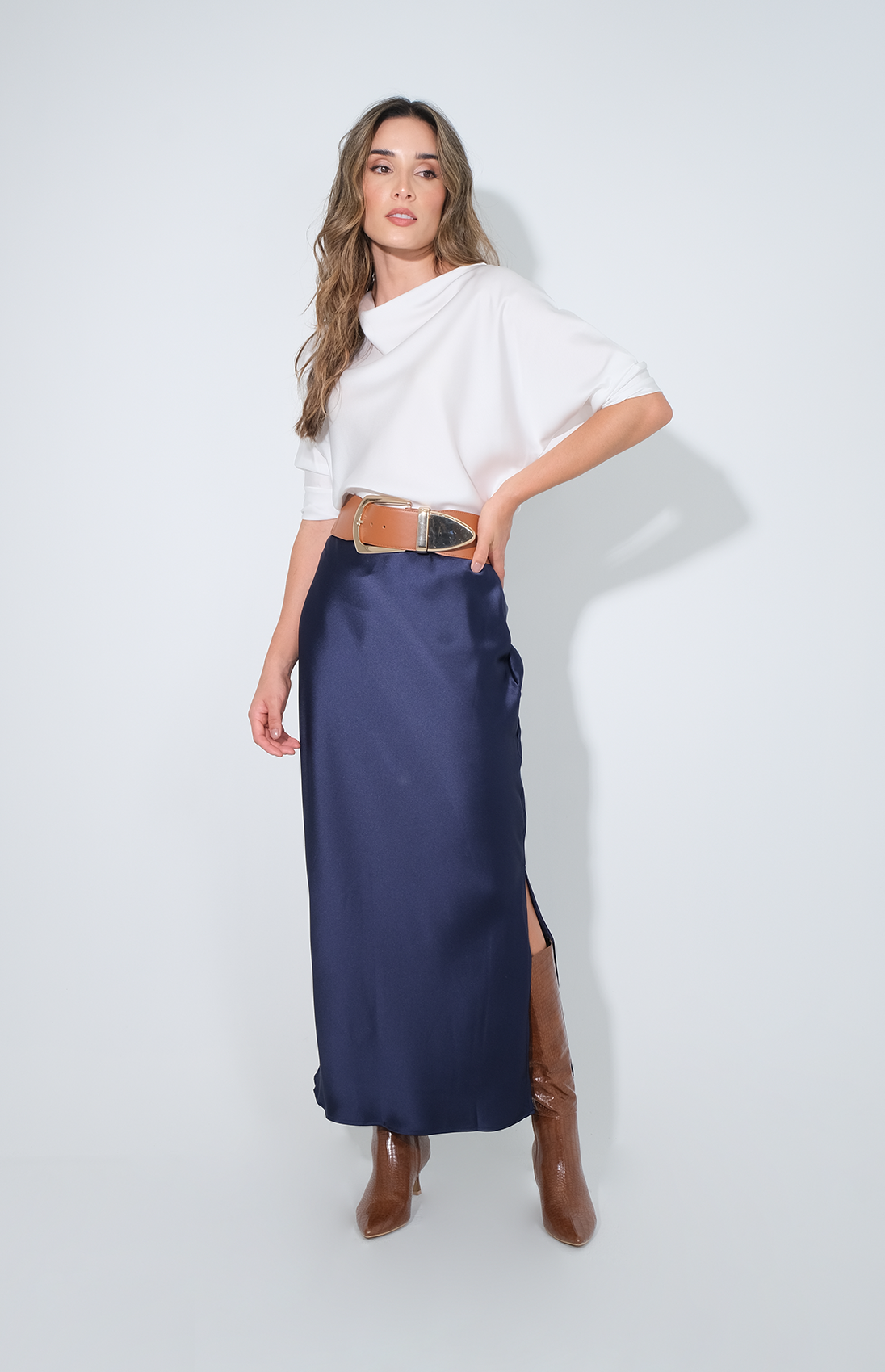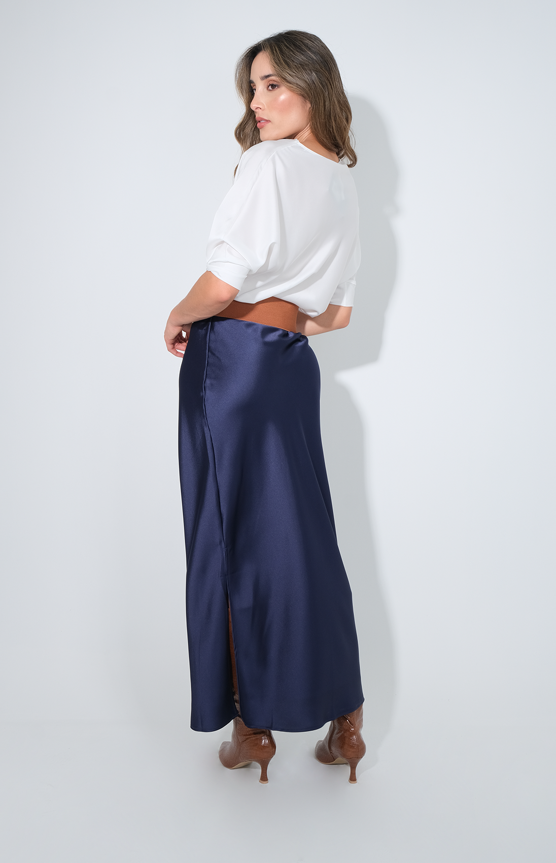 Falda Larga Satinada Azul Oscuro y Café con Resorte en Cintura y Abertura a un Lado: Deslumbra con nuestra encantadora Falda Larga Satinada en tonos azul oscuro y café. Con resorte en la cintura para un ajuste perfecto y una elegante abertura a un lado, esta falda añade un toque de estilo y sofisticación a tu look. Ideal para eventos formales o salidas nocturnas.