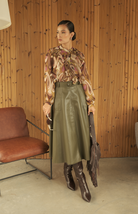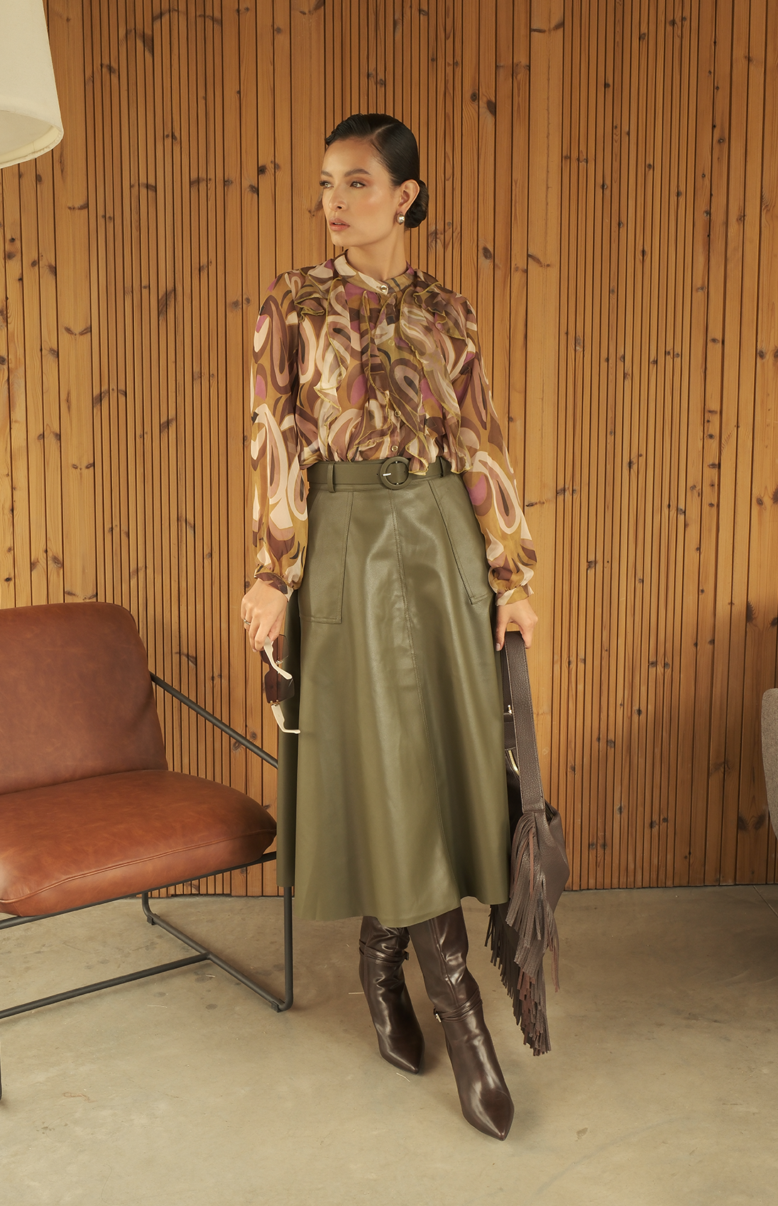 Esta falda en cuerina presenta un diseño en corte A que estiliza la figura con elegancia. Su costura en el centro añade un detalle sofisticado y estructurado, mientras que sus dos bolsillos laterales combinan funcionalidad y estilo.