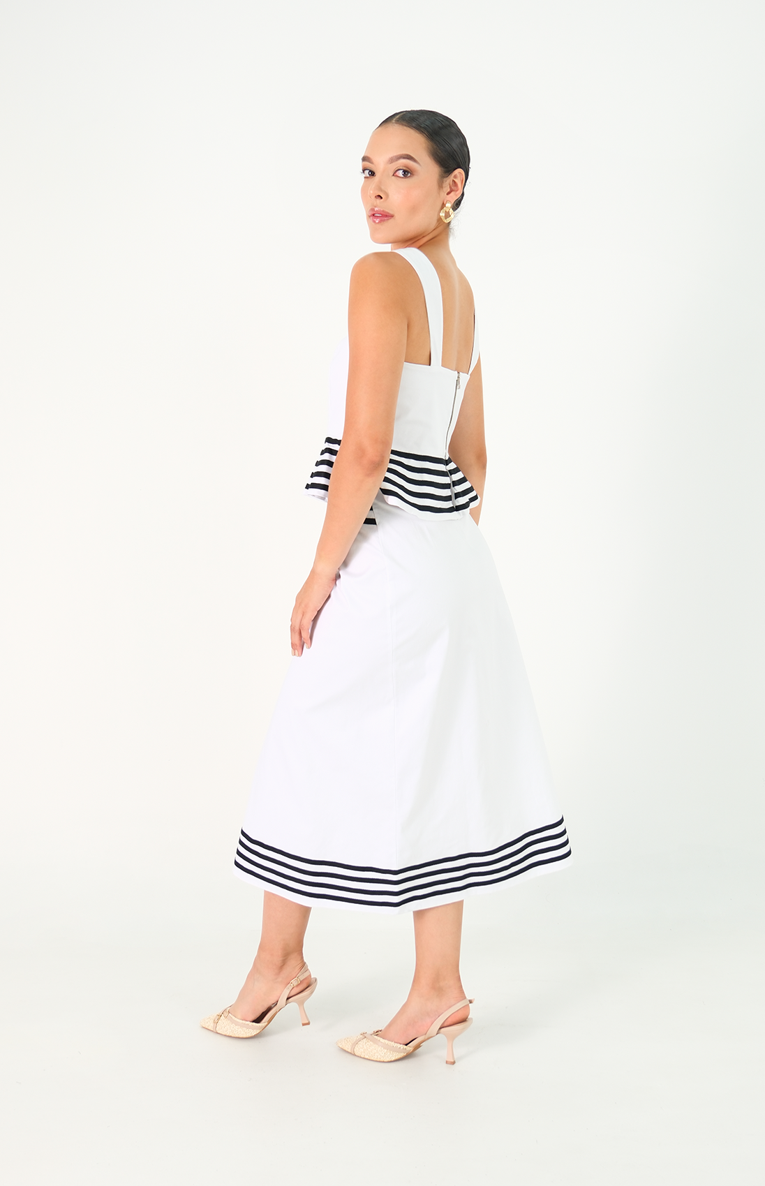 Esta falda 3/4 combina sofisticación y estilo con franjas negras que enmarcan la cintura y el borde, realzando su diseño con contraste elegante. El botón lateral aporta un detalle distinguido, ideal para lucir un look moderno y refinado en cualquier ocasión.