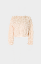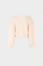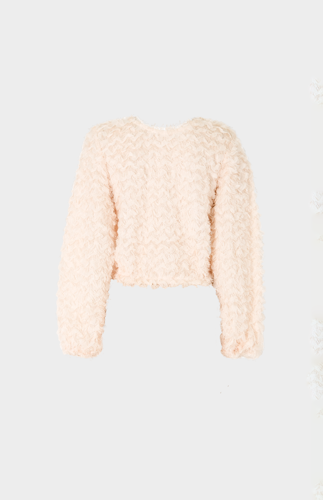Jersey de manga larga con textura en relieve que forma pétalos, diseñado con cierre posterior que proporciona un ajuste personalizado y cómodo. Pieza versátil que destaca elegancia contemporánea.