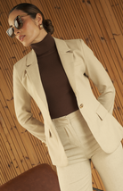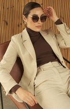 Este blazer topo de lino combina elegancia y confort con su diseño clásico de solapas y un botón dorado que añade un toque de distinción. Ofrece una silueta refinada y una textura fresca que garantiza un acabado sofisticado y atemporal.