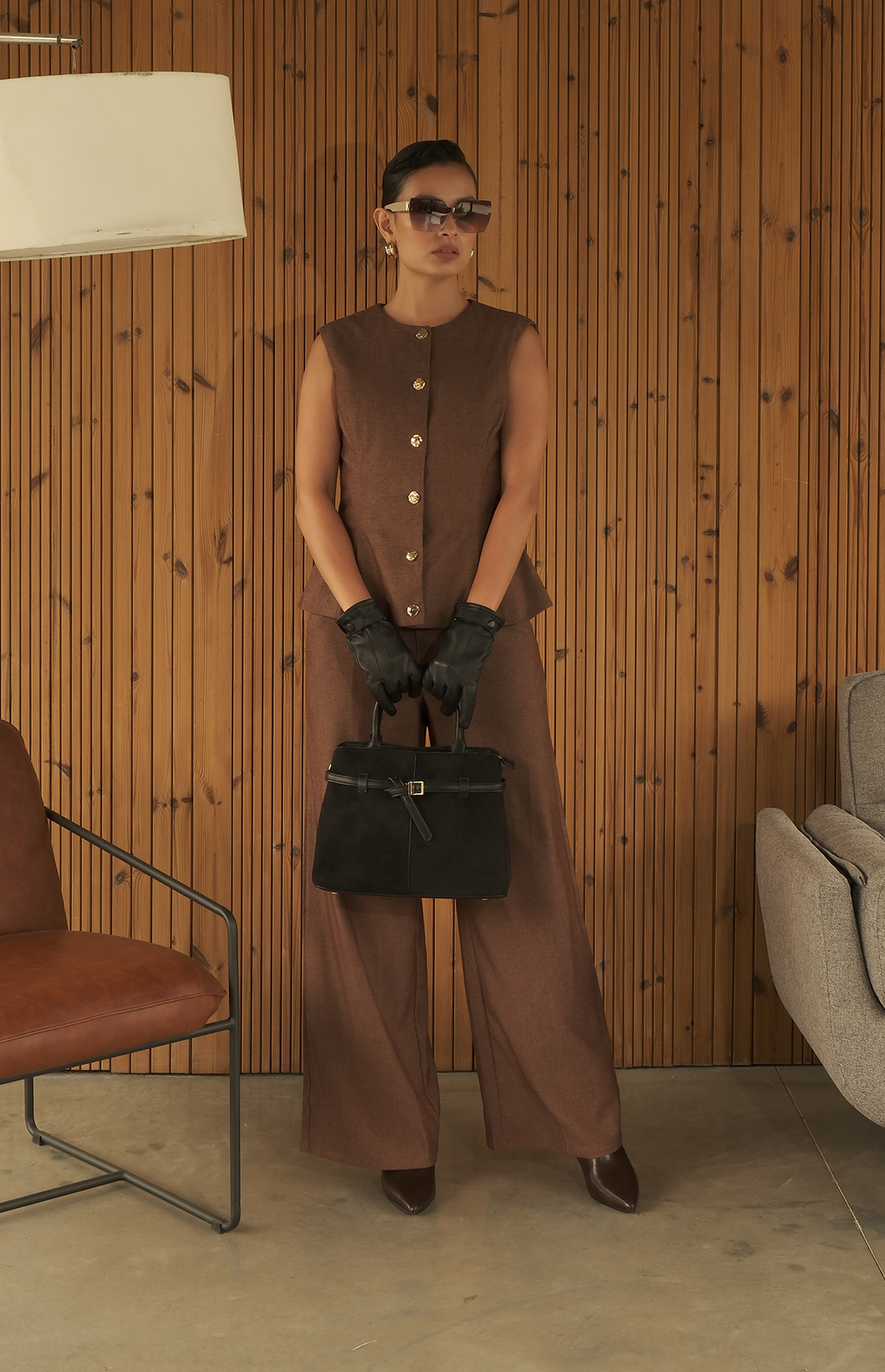 Este chaleco presenta un diseño elegante con seis botones dorados, Su cuello redondo y las pinzas delanteras acentúan una silueta estructurada que aportan distinción y estilo.