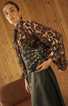 Esta blusa de manga larga presenta un elegante estampado leopardo y un detalle exclusivo: tiras delicadas a un lado del cuello que permiten crear un moño sofisticado. Perfecta para quienes buscan un toque de distinción en su atuendo diario.