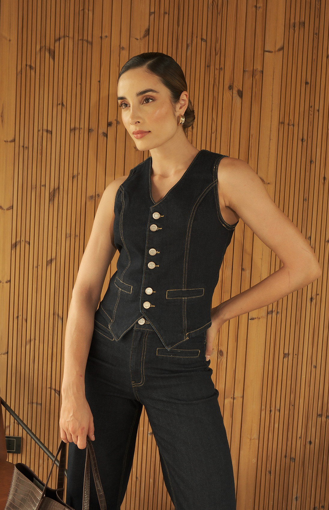 Este chaleco en denim presenta un diseño clásico con seis botones frontales, su acabado impecable y corte estructurado lo convierten en una prenda versátil para elevar cualquier look con sofisticación y estilo atemporal.