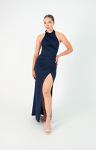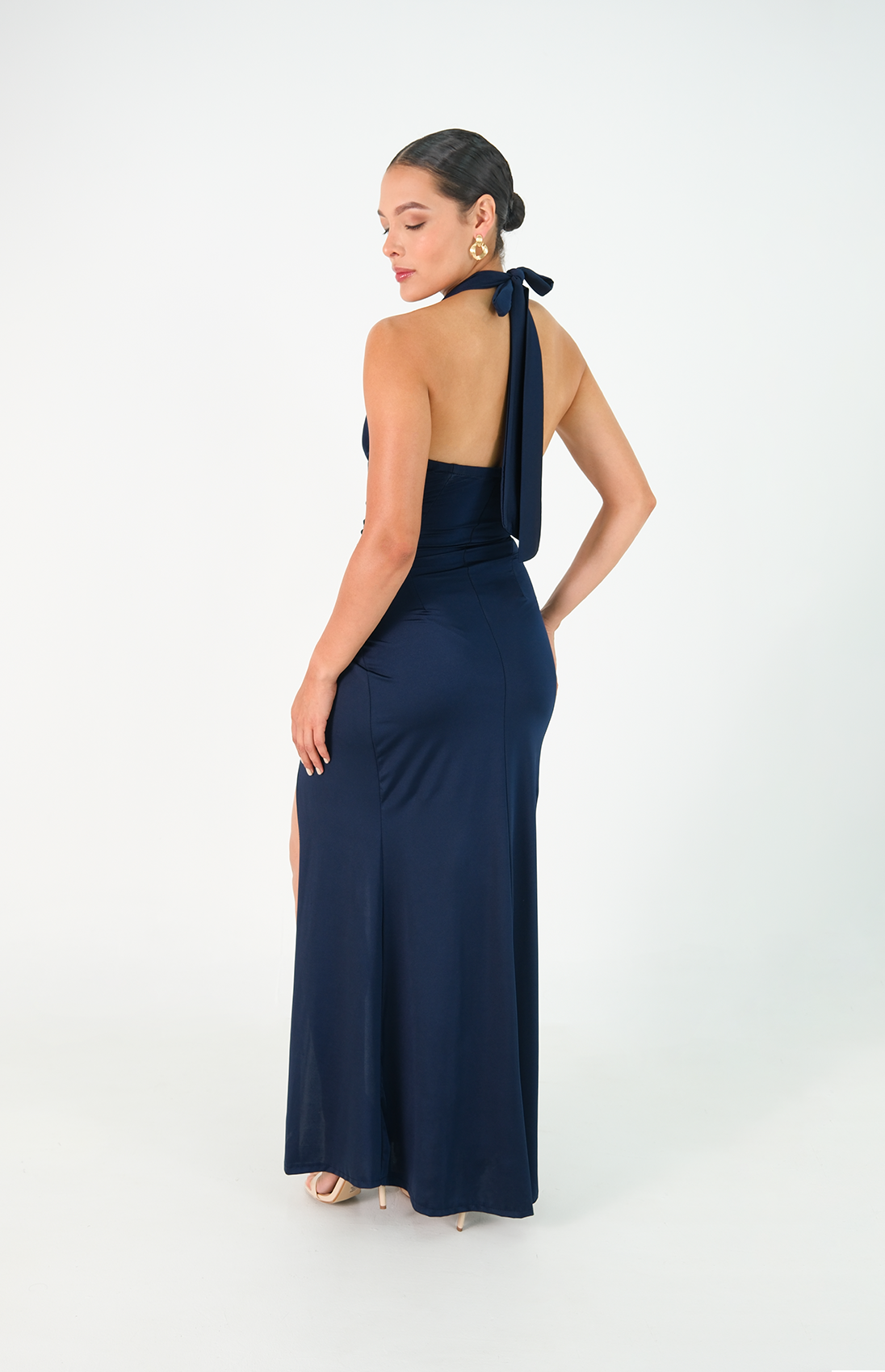 Este vestido largo azul oscuro sin mangas destaca por su diseño elegante con cuello alto y un fruncido delicado en el lado izquierdo que realza la figura con sutileza ideal para ocasiones formales.
