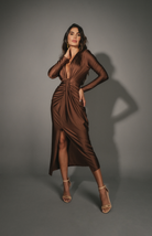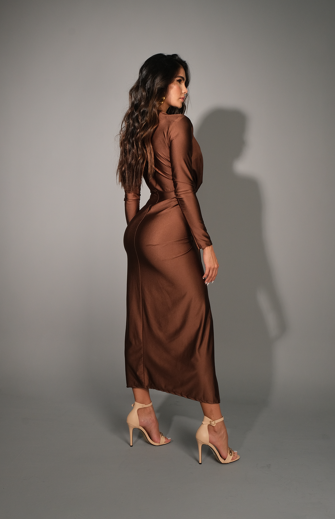 Vestido licrado largo 3/4 con manga larga y escote en V profundo.