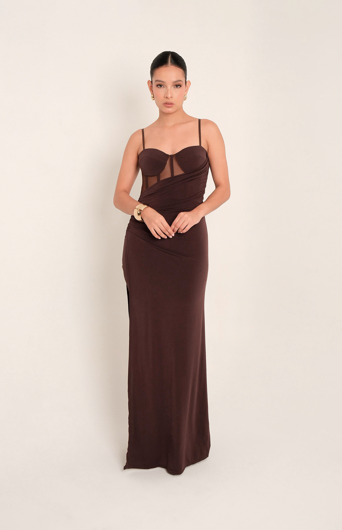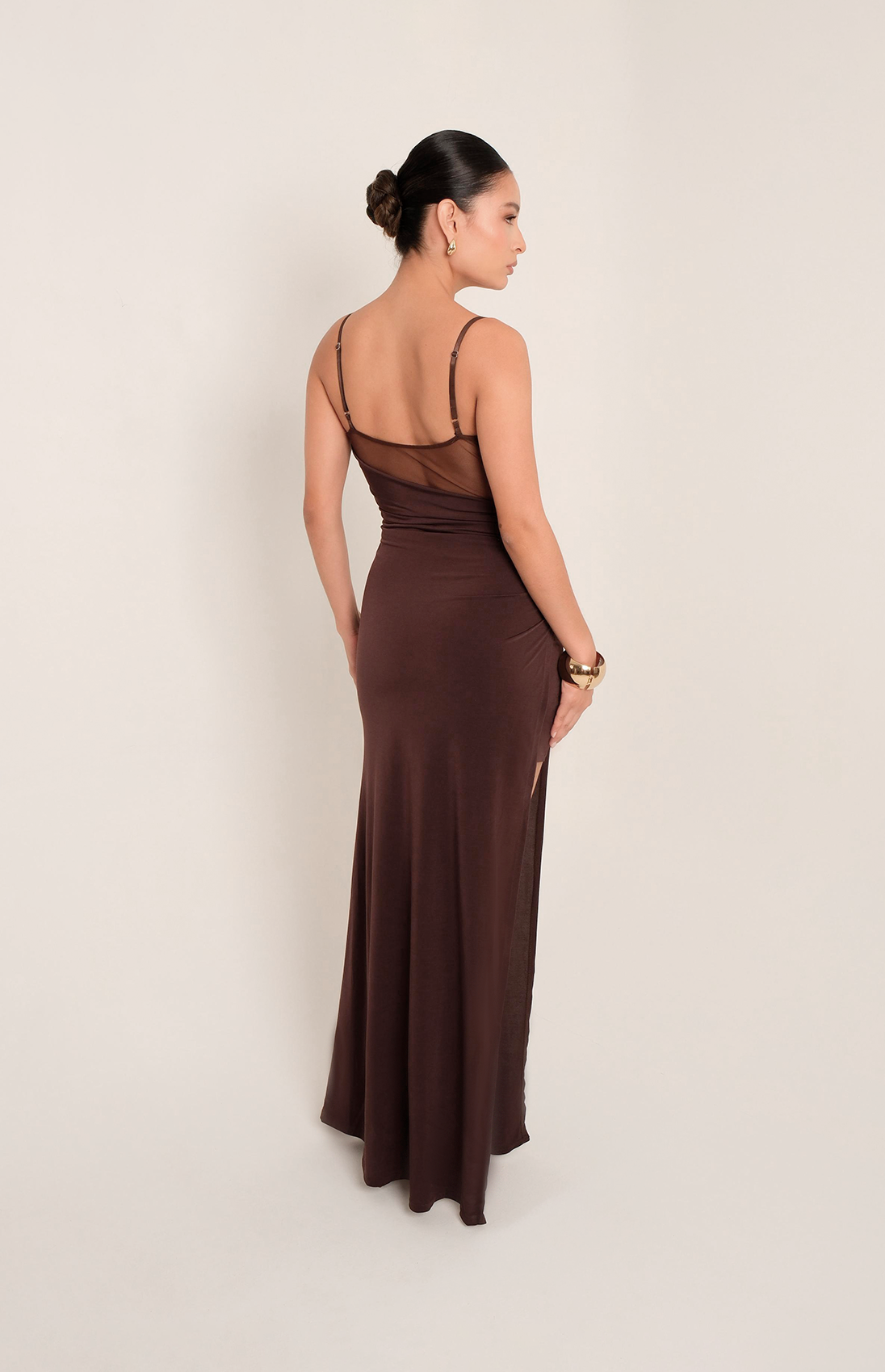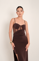 Este vestido largo café combina un diseño de tiras tipo corset con detalles transparentes que realzan su delicadeza. La abertura lateral añade un toque sutil de sensualidad, equilibrando elegancia y modernidad para un look sofisticado ideal en ocasiones especiales.