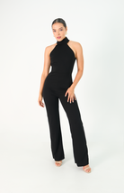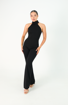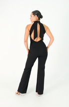 Este enterizo negro sin mangas combina estilo y comodidad con su tejido licrado que se ajusta perfectamente al cuerpo. Destaca por su cuello alto y la espalda descubierta, adornada con dos tiras que caen desde el cuello, creando un diseño elegante y moderno ideal para cualquier ocasión especial.
