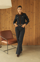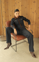Jean azul oscuro con bordes trenzados en tono café, su corte de bota recta brinda una silueta sofisticada y versátil, perfecta para combinar con diferentes estilos y ocasiones.