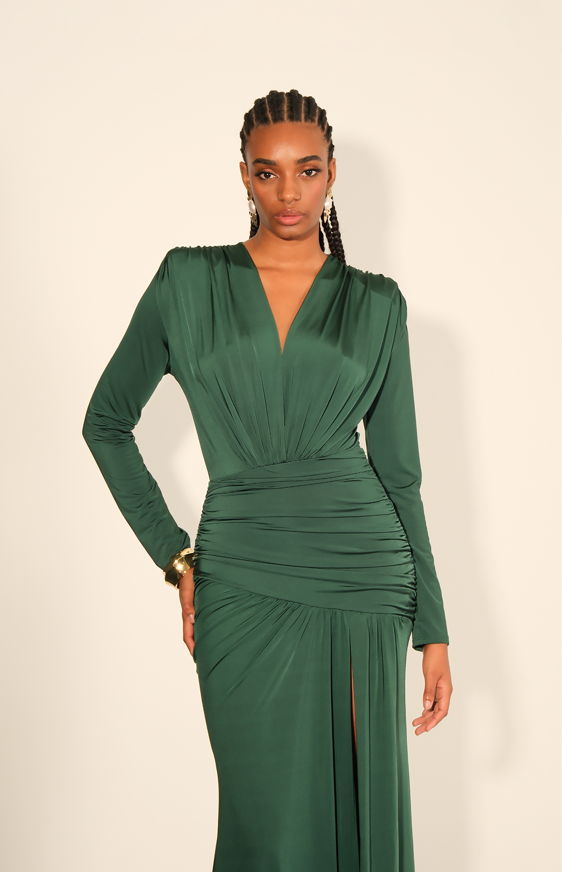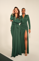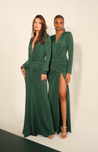 Vestido con escote en V, mangas largas que añaden elegancia clásica y drapeado en la cintura que marca y define la figura. Perfecto para eventos formales, galas o encuentros donde la distinción es protagonista.