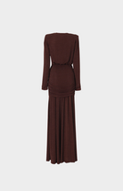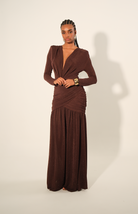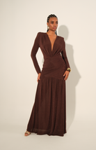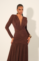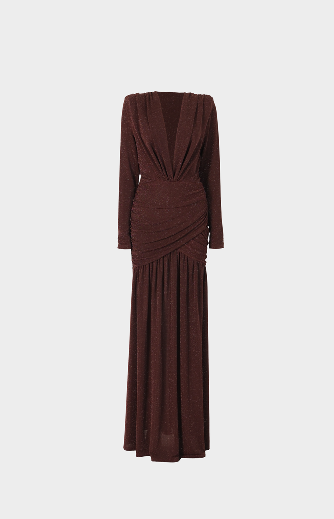 Vestido en tono chocolate en lurex con escote en V, mangas largas que envuelven con refinamiento y un drapeado estratégico en la cintura que esculpe la silueta con precisión. La tela lurex brinda un brillo sutil y sofisticado ideal para ocasiones especiales.