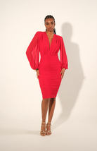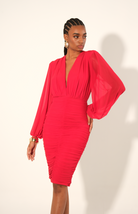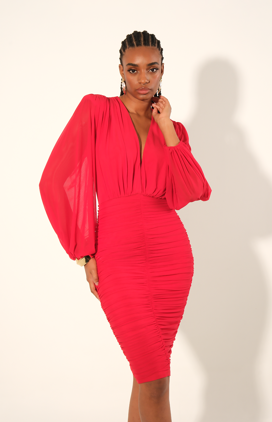 Vestido confeccionado en tela mesh con diseño de largo 3/4, mangas largas y escote en V que favorece la silueta. Detalle de surcido en la falda que añade textura al conjunto.