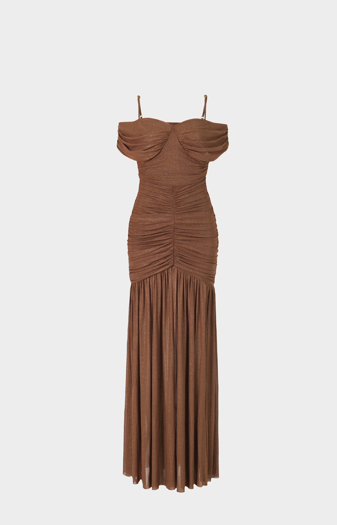 Vestido en tela lurex cuello bandeja, con mangas caídas que crean un efecto fluido y sofisticado, mientras que el drapeado añade movimiento y distinción.
