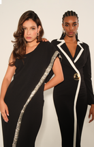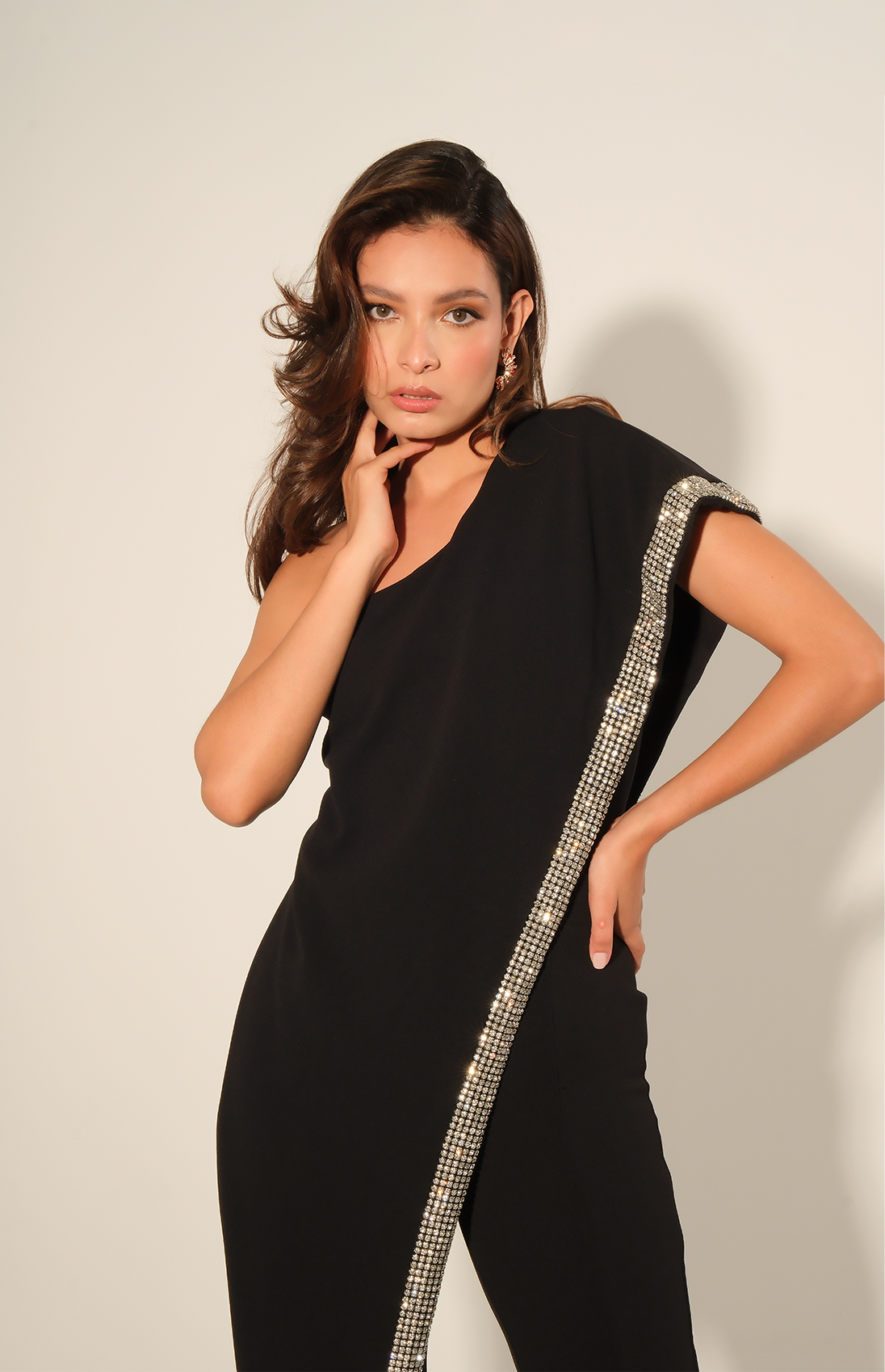 Enterizo negro asimétrico cautiva con su diseño de un solo hombro descubierto, creando una línea elegante y moderna. La sobrefalda que fluye desde el hombro añade movimiento y dramatismo, mientras que el aplique de piedras en el borde aporta un brillo cautivador y refinamiento. Una prenda de alta costura que expresa confianza y distinción, ideal para eventos donde la sofisticación es protagonista.