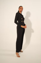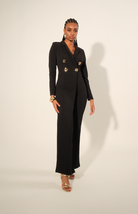 Enterizo negro con mangas largas que exudan elegancia contemporánea. Destaca por su solapa estructurada y cuatro maxi botones dorados en el frente, detalles que confieren un aire de distinción y refinamiento