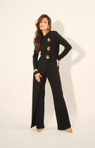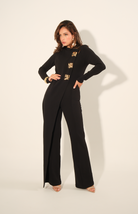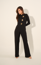 Enterizo negro de manga larga con cuello redondo que favorece cualquier tipo de rostro. La sobrefalda añade movimiento y dimensión a la silueta, mientras que los tres maxi botones dorados cuadrados en el frente aportan un detalle de lujo y personalidad.