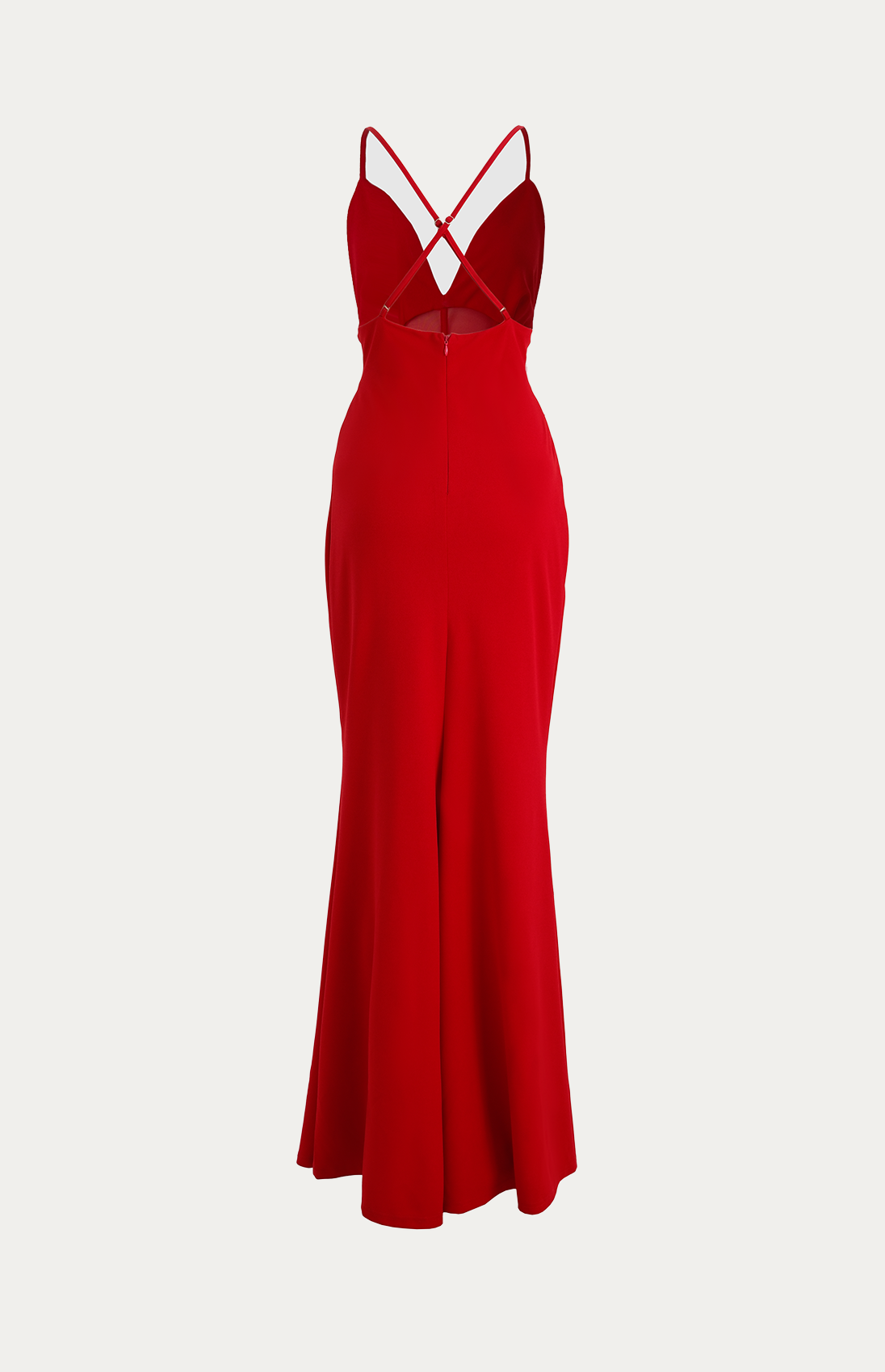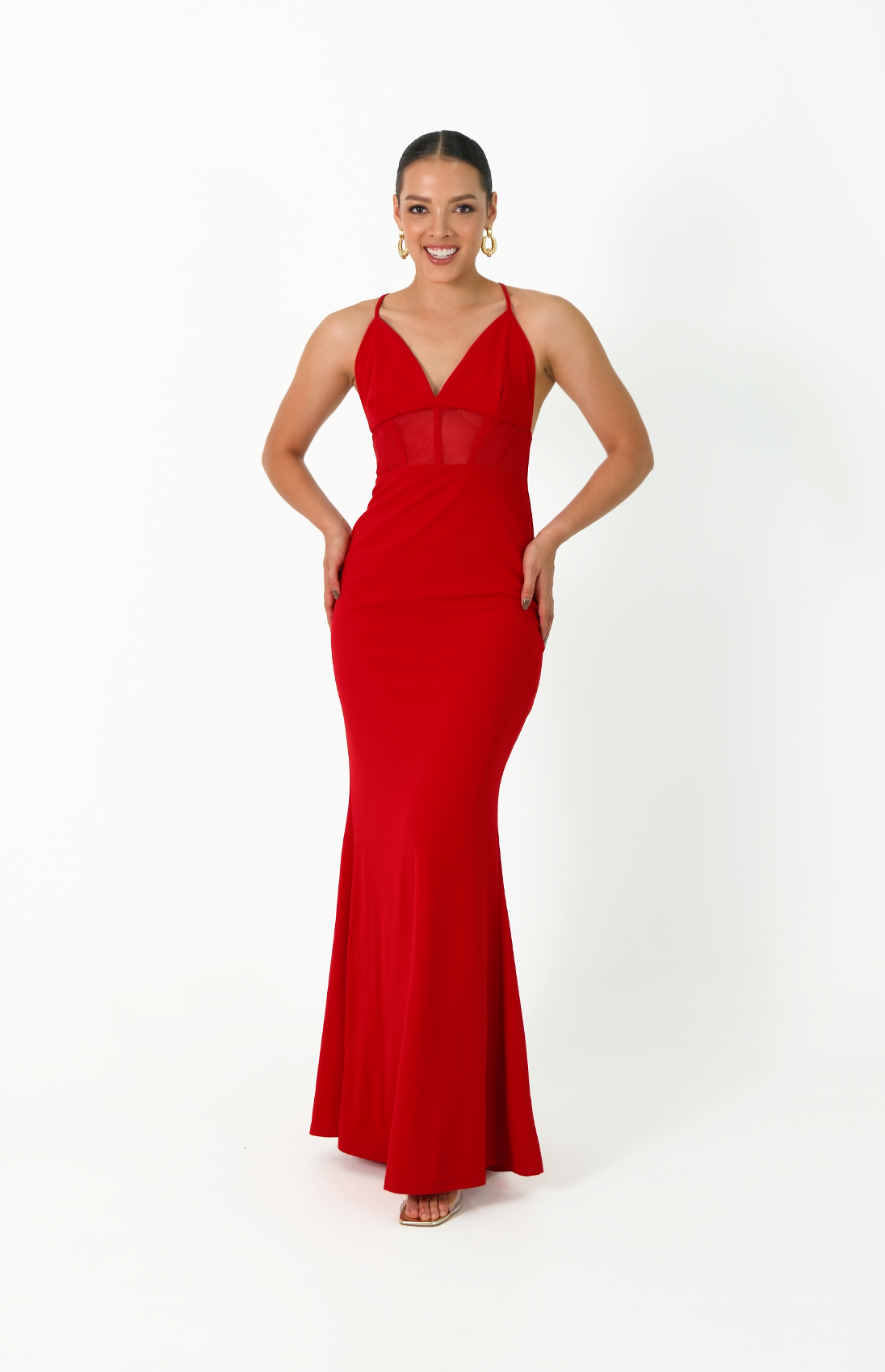 Este vestido rojo combina elegancia y sensualidad con su tela elástica que se ajusta perfectamente al cuerpo. Presenta tiras delicadas y un corsé que realza la figura, mientras la transparencia en el abdomen añade un toque sofisticado sin necesidad de aberturas. Ideal para ocasiones donde quieres destacar con estilo y sofisticación.