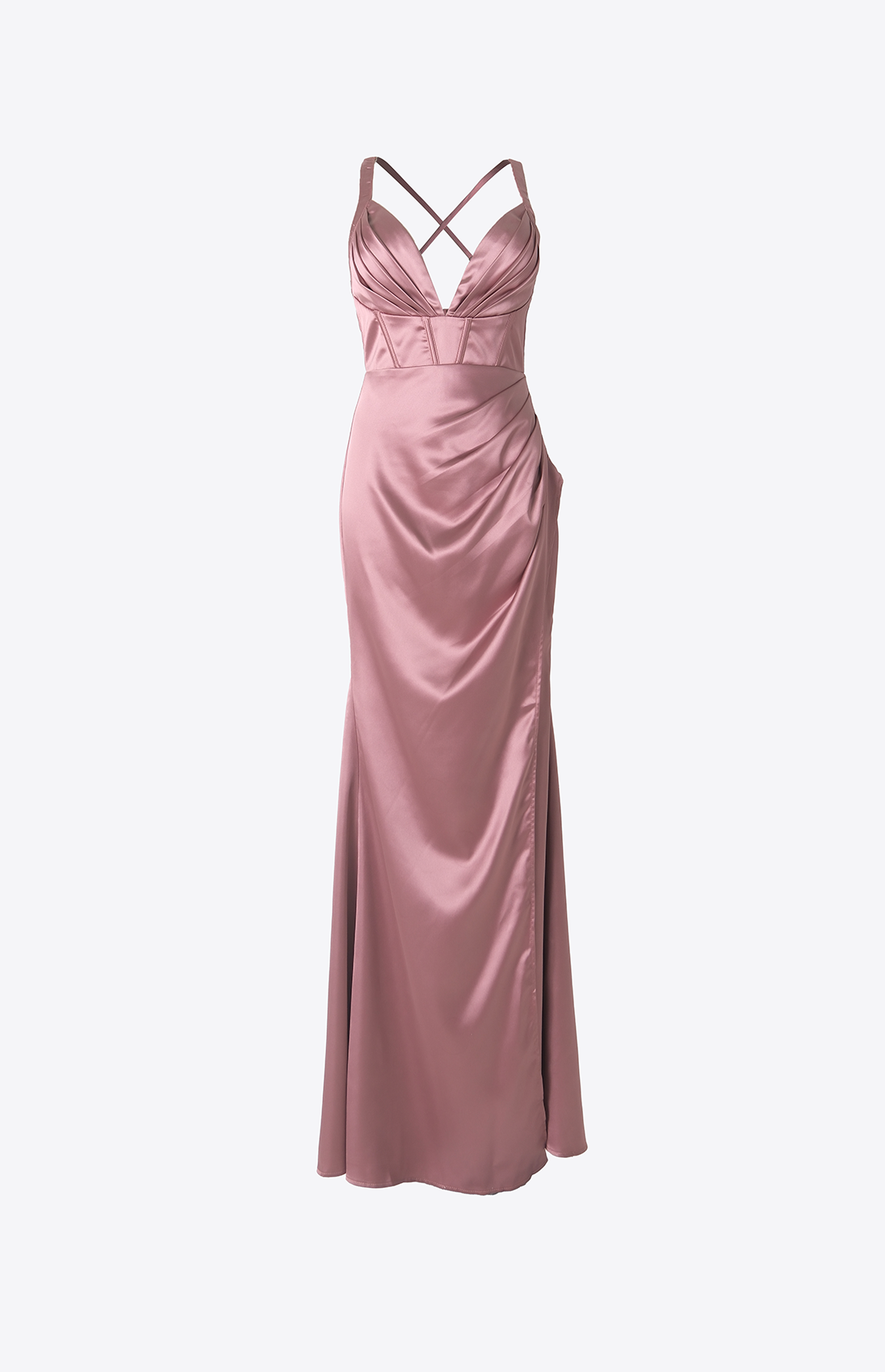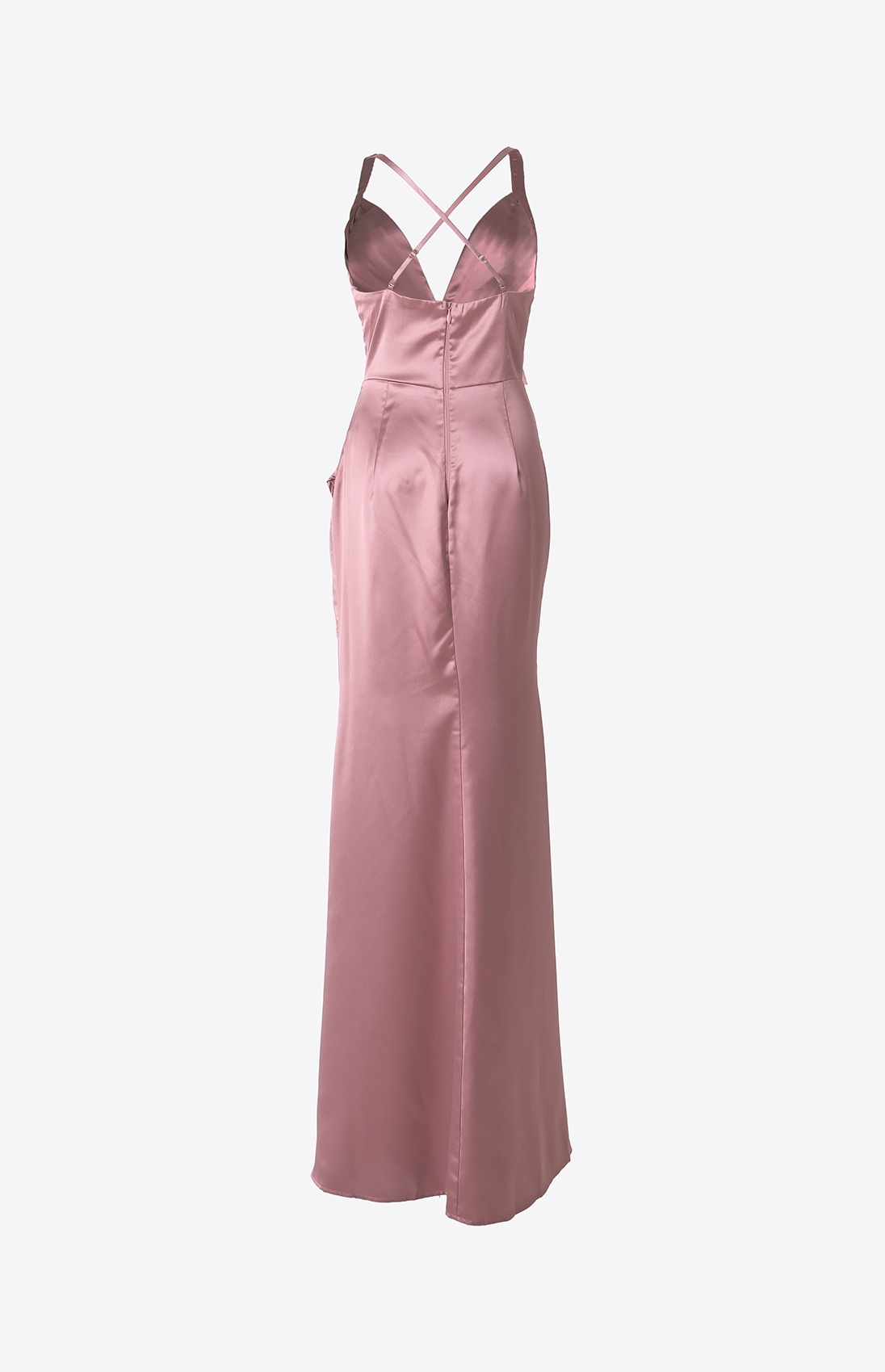 Este vestido satinado en color palo de rosa combina elegancia y feminidad con su escote en V y tiras delicadas. El corset integrado define la figura con gracia, mientras que la abertura lateral aporta un detalle sofisticado que realza el movimiento. Ideal para eventos donde el estilo refinado es esencial.