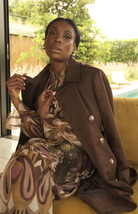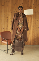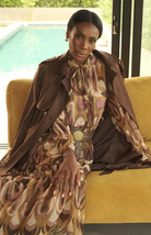 Vestido largo estampado combina elegancia y delicadeza con su tela ligeramente transparente. Las mangas largas con resorte en los puños aportan un acabado refinado y cómodo, mientras que las tiras en el cuello añaden un detalle sofisticado que realza el diseño.