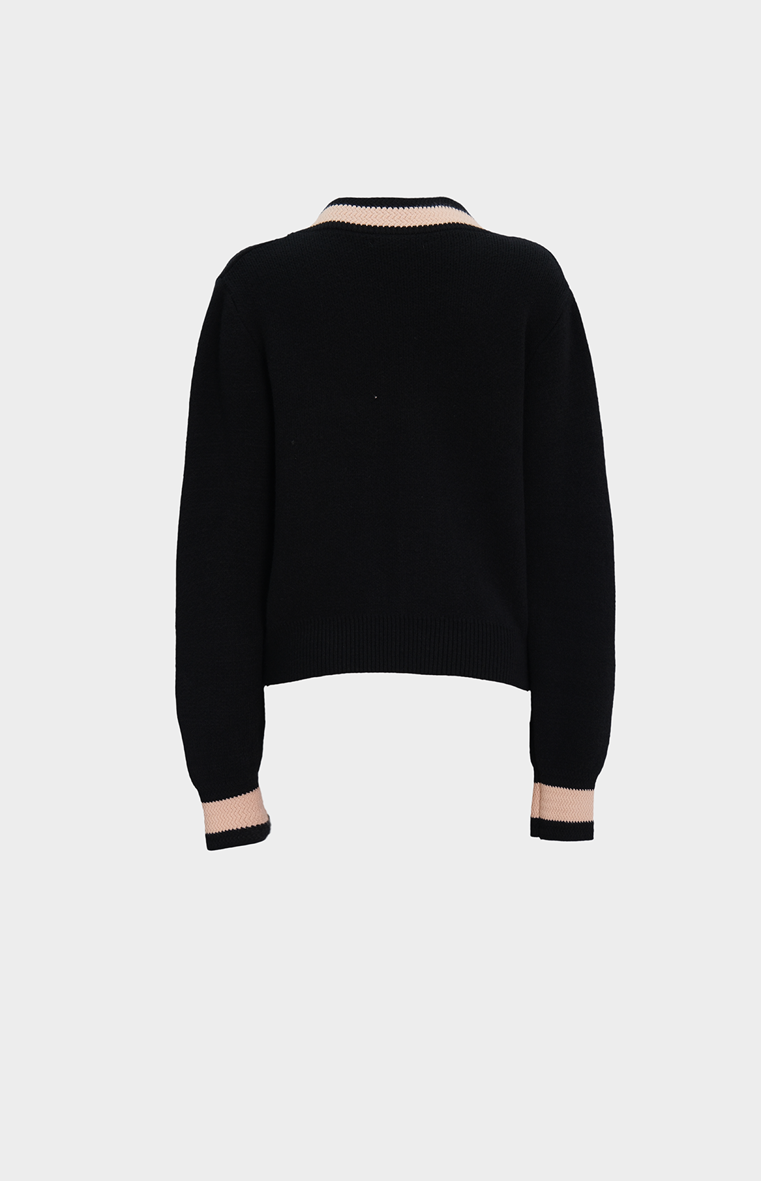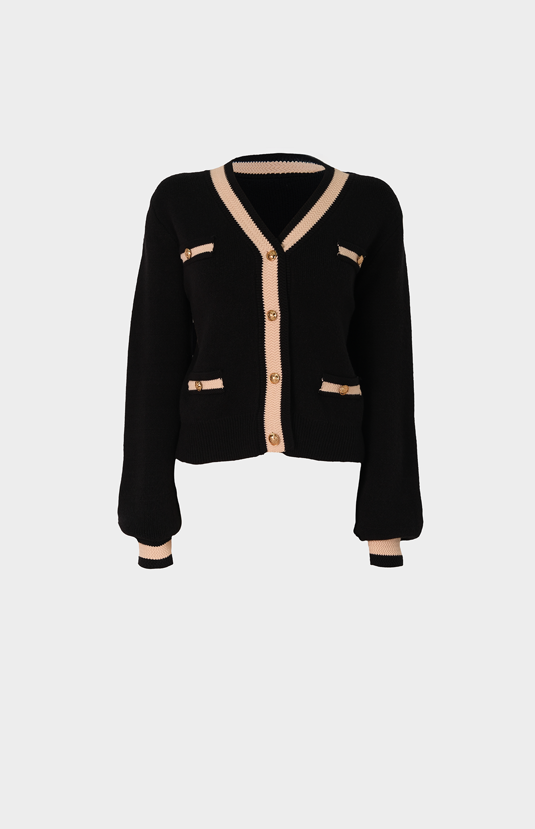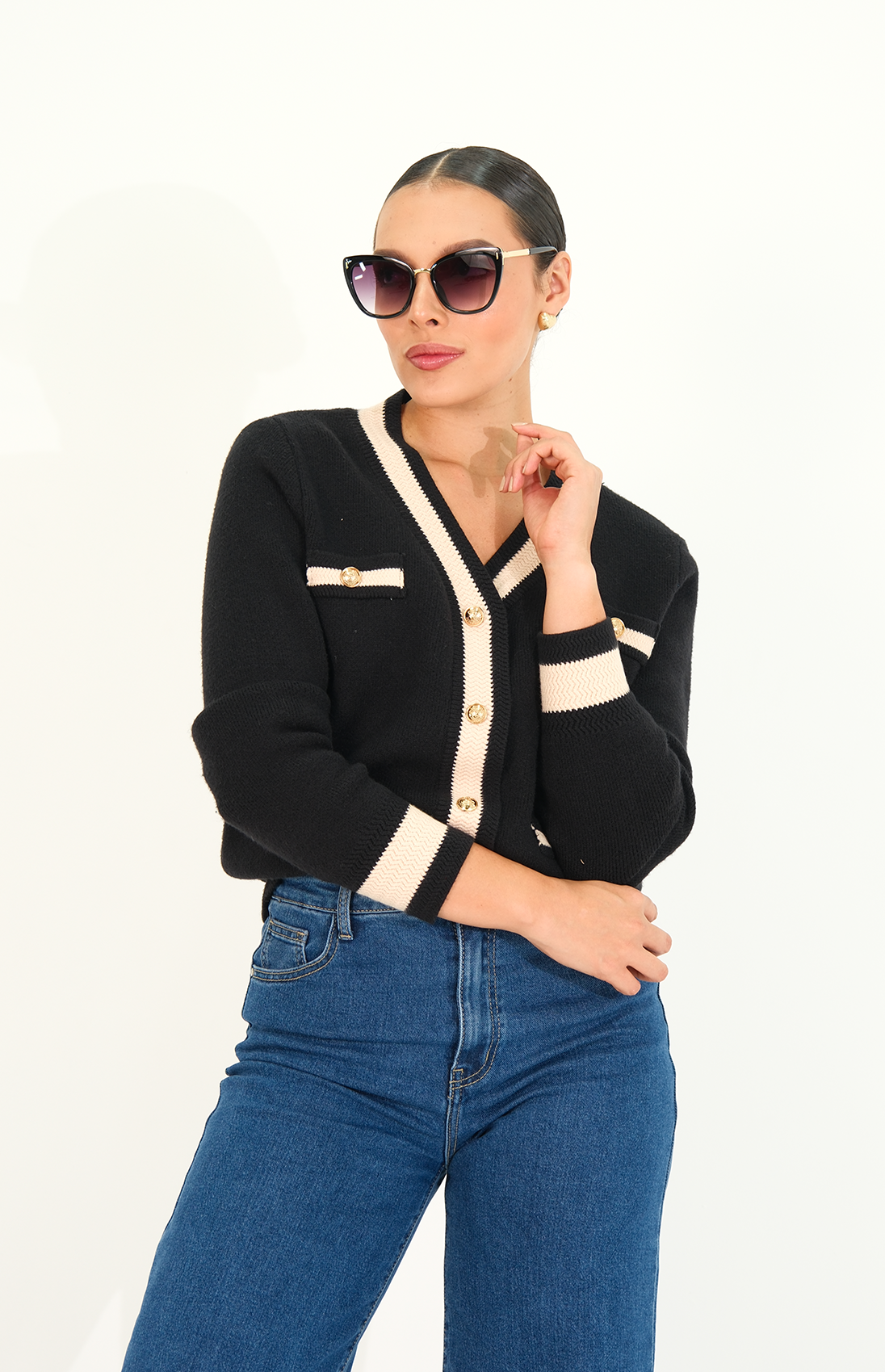 Jersey con cuello V con borde beige y cuatro botones dorados que añaden un toque de distinción, mientras que el borde beige proporciona un acabado elegante y equilibrado.