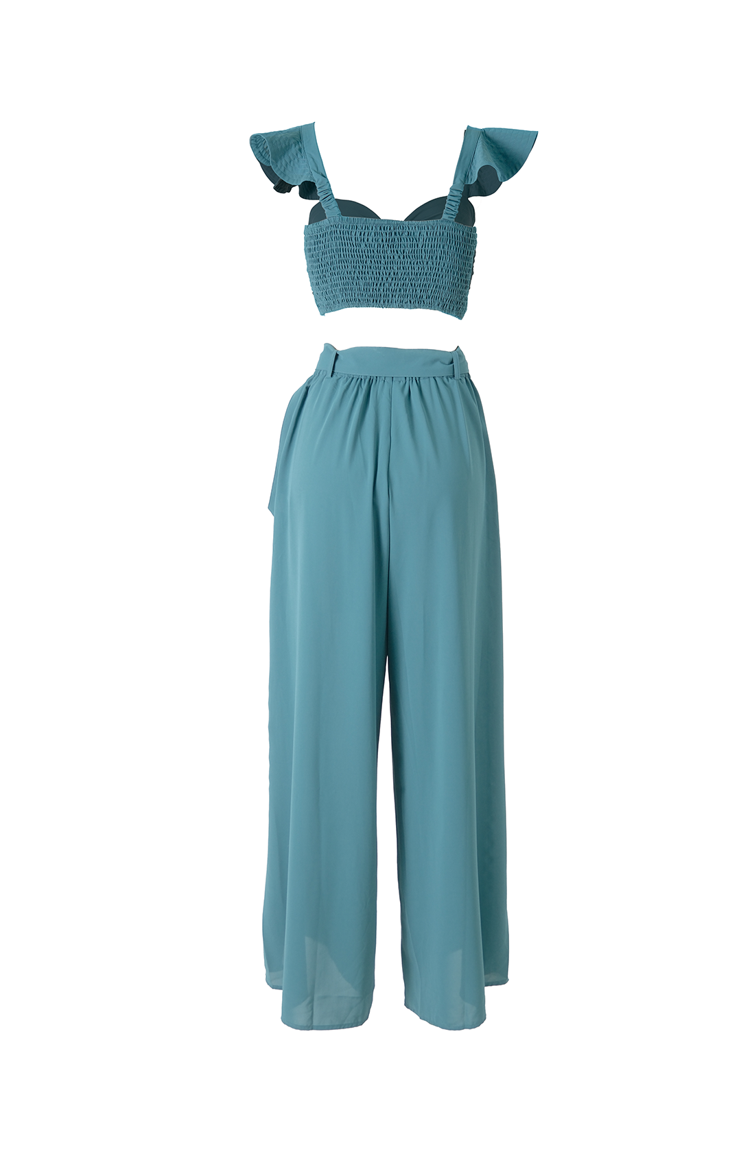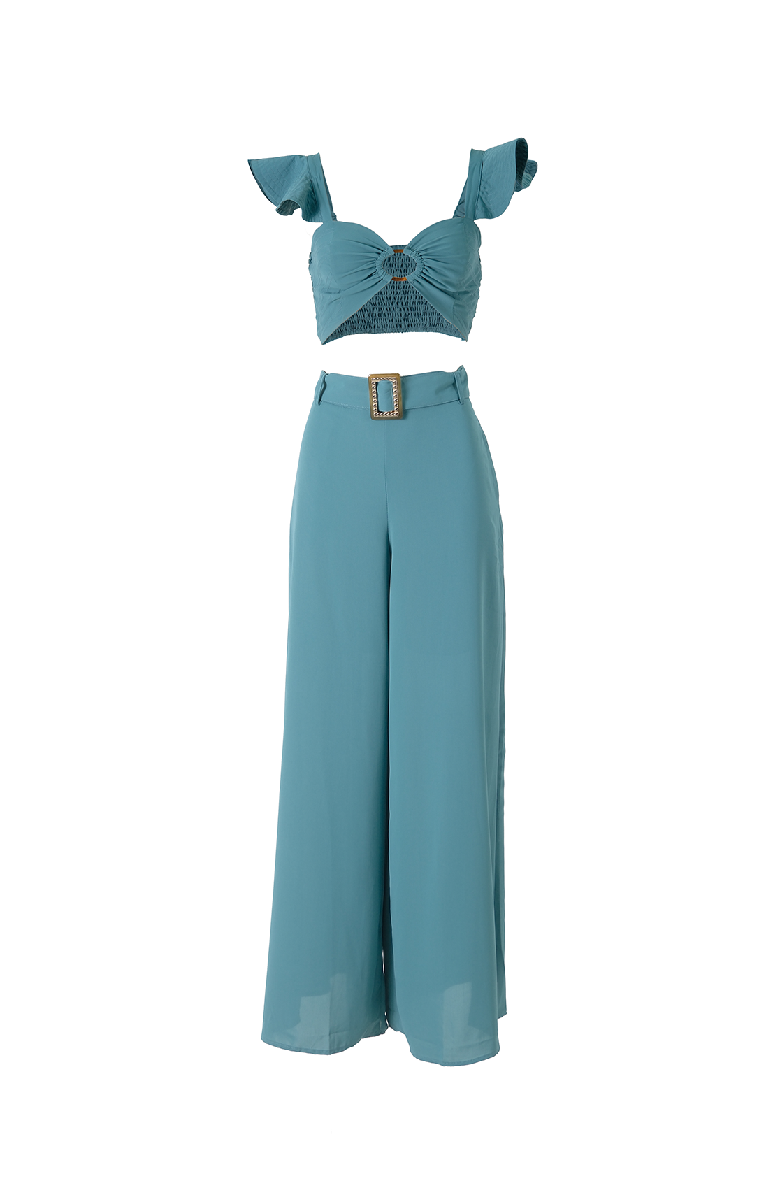 Conjunto Azul con Pantalón y Top - Este conjunto azul incluye un pantalón con correa y un top, ideal para un look coordinado y elegante. ¡Añádelo a tu guardarropa hoy!