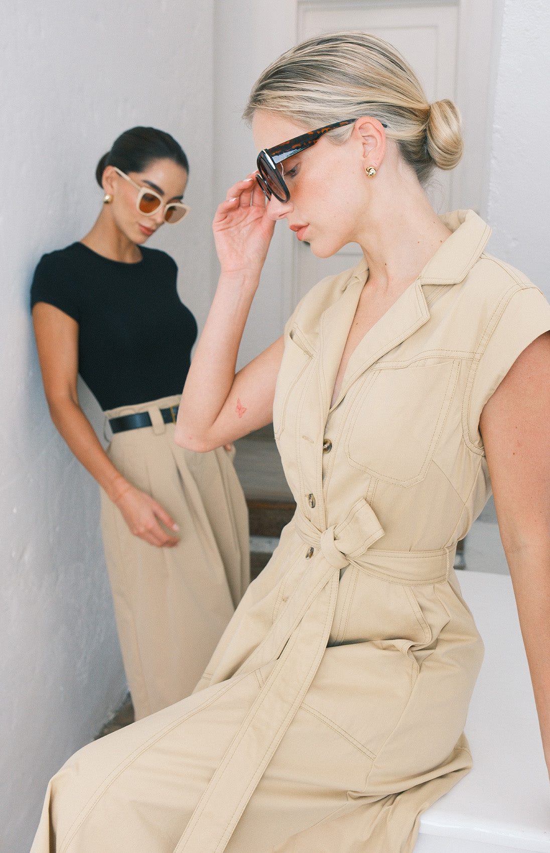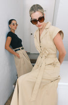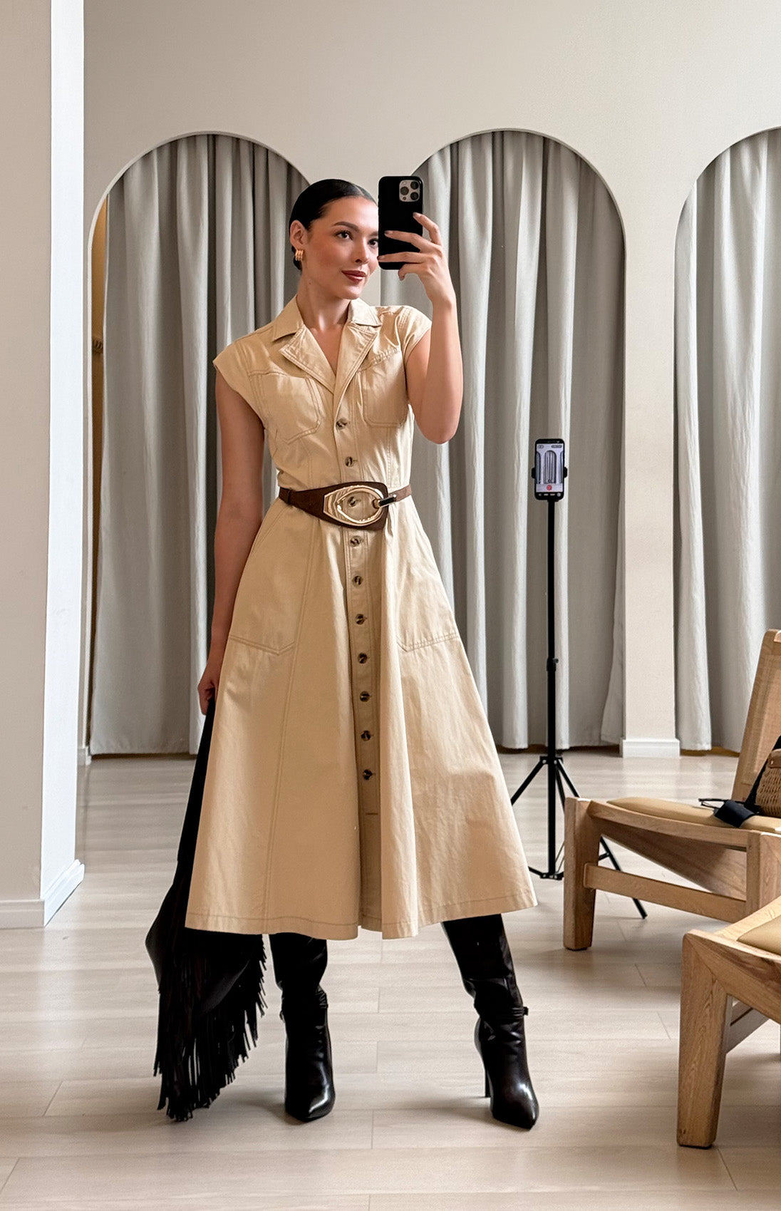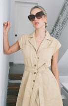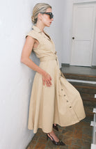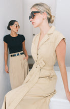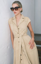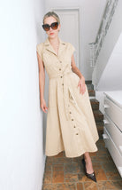 vestido camisero en corte midi. Diseñado con cuello clásico y mangas sisa para una silueta moderna. Cuenta con botones frontales, bolsillos prácticos y cinturón ajustable que realza la definición de la cintura. Una pieza versátil perfecta para transiciones entre el día y la noche.