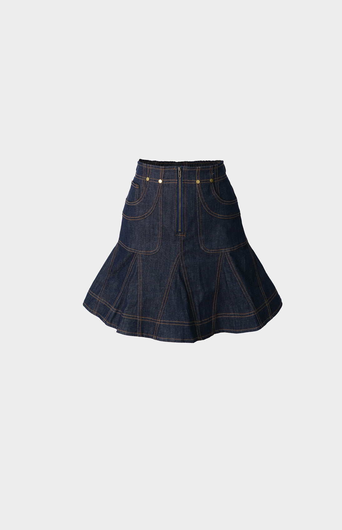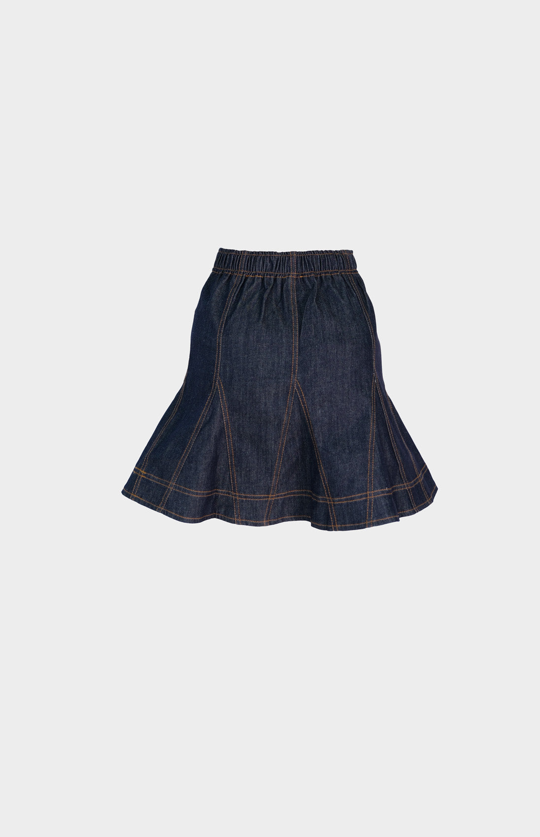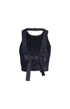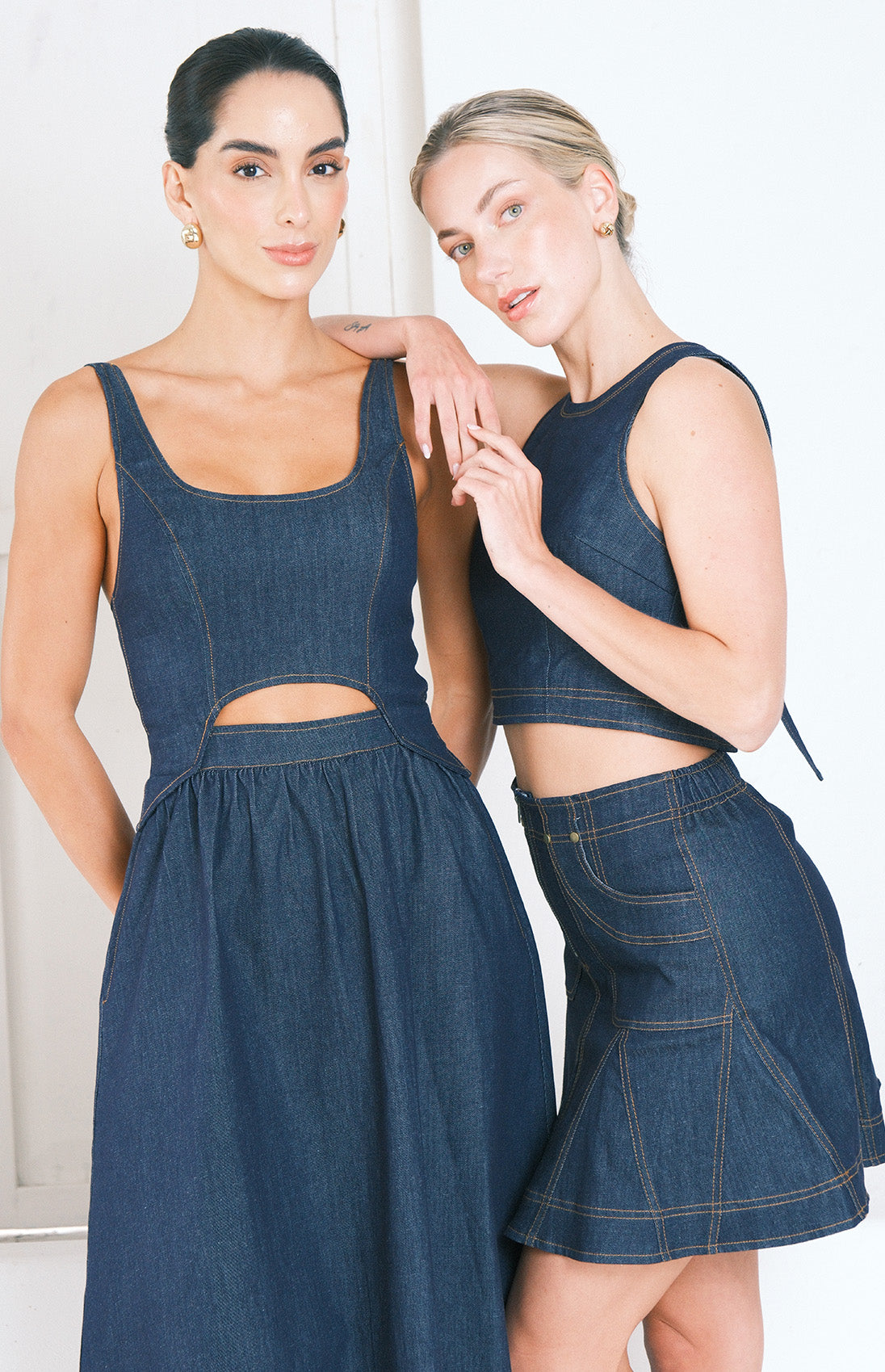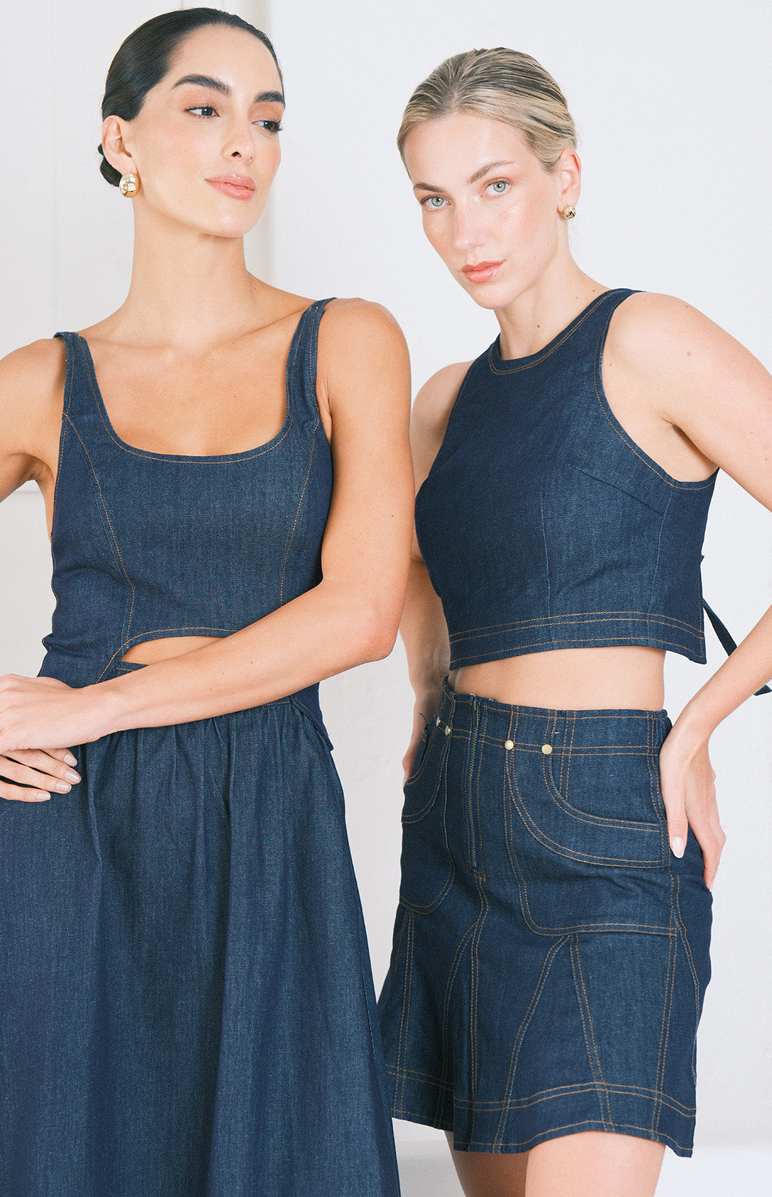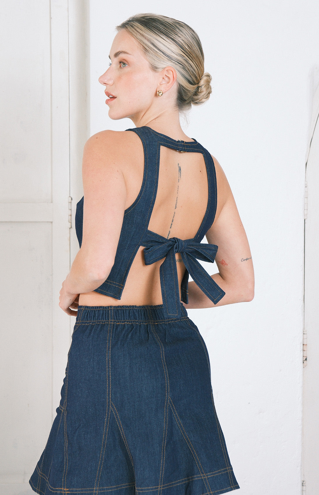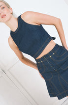 Conjunto en denim oscuro con costuras café, de falda corta con cierre frontal y cintura elástica ofrece comodidad y movimiento, mientras que el top con tiras en la espalda que se transforman en moño añade un toque de feminidad y versatilidad. Una propuesta que equilibra practicidad con presencia sofisticada.