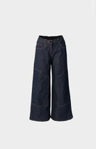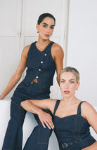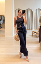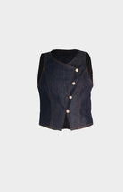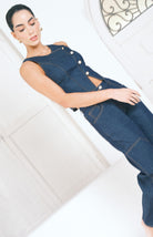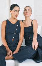 Conjunto denim oscuro de pantalón de bota recta con cintura elástica ofrece libertad de movimiento, mientras que el chaleco estructurado con cuatro botones dorados dispuestos en diagonal aporta un toque de refinamiento. Una propuesta versátil que trasciende las tendencias pasajeras.