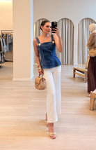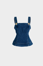 Blusa en denim con tiras anchas adornadas con accesorios dorados en forma de concha, con cierre metálico en la espalda que añade funcionalidad con estilo.
